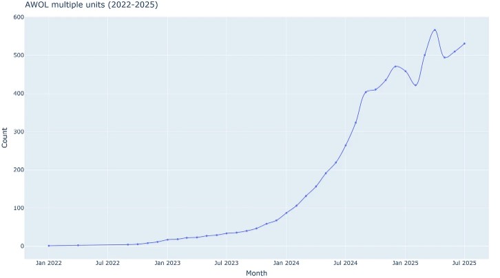 - К лету 2025 года ежемесячное число случаев дезертирства и самовольного оставления частей было почти в шесть раз выше, чем в январе 2024-го, свидетельствует один из документов, содержащий список из 13,8 тысячи таких случаев с именами и номерами подразделений за период с 2022 года по июль 2025-го. Уровень дезертирства стабильно рос в течение 2024 года, и хотя в начале 2025-го наблюдалось кратковременное снижение числа случаев дезертирства, вскоре рост возобновился, говорится в исследовании. Согласно документу, с января по неполный июль 2025 года зарегистрировано 3,4 тысячи случаев дезертирства, тогда как за весь прошлый год — 3,2 тысячи, говорится в исследовании.