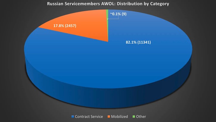 - Из 13,8 тысячи случаев дезертирства, зафиксированных в первом документе, 11,3 тысячи приходились на контрактников, 2,4 тысячи — на мобилизованных, а девять случаев — на другие категории, в том числе призывников.