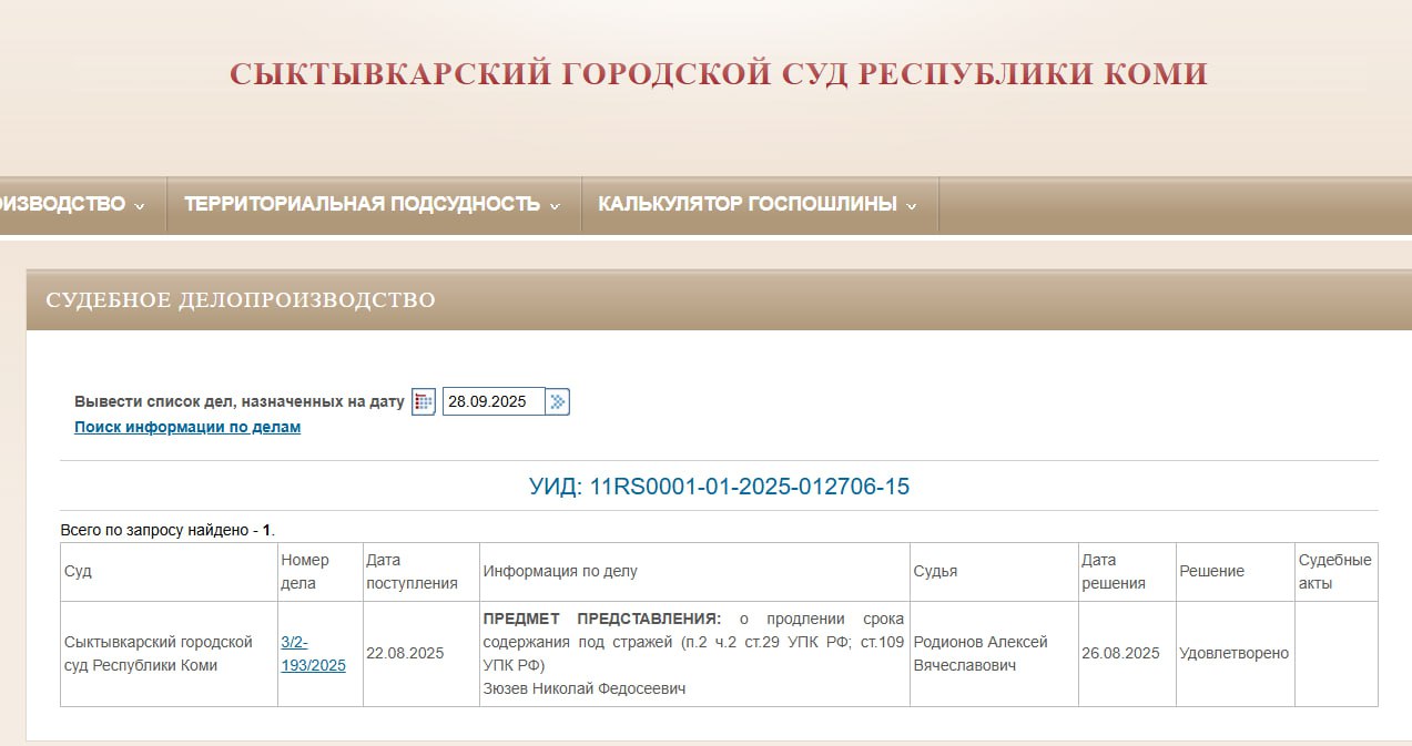 26 августа судья Сыктывкарского горсуда Алексей Родионов продлил содержание Николая Зюзева под стражей. Обычно российские суды принимают такие решения до истечения первых двух месяцев пребывания человека в СИЗО. Судя по всему, задержали учёного ещё в конце июня, о чём не сообщали ни региональные СМИ, ни его знакомые.