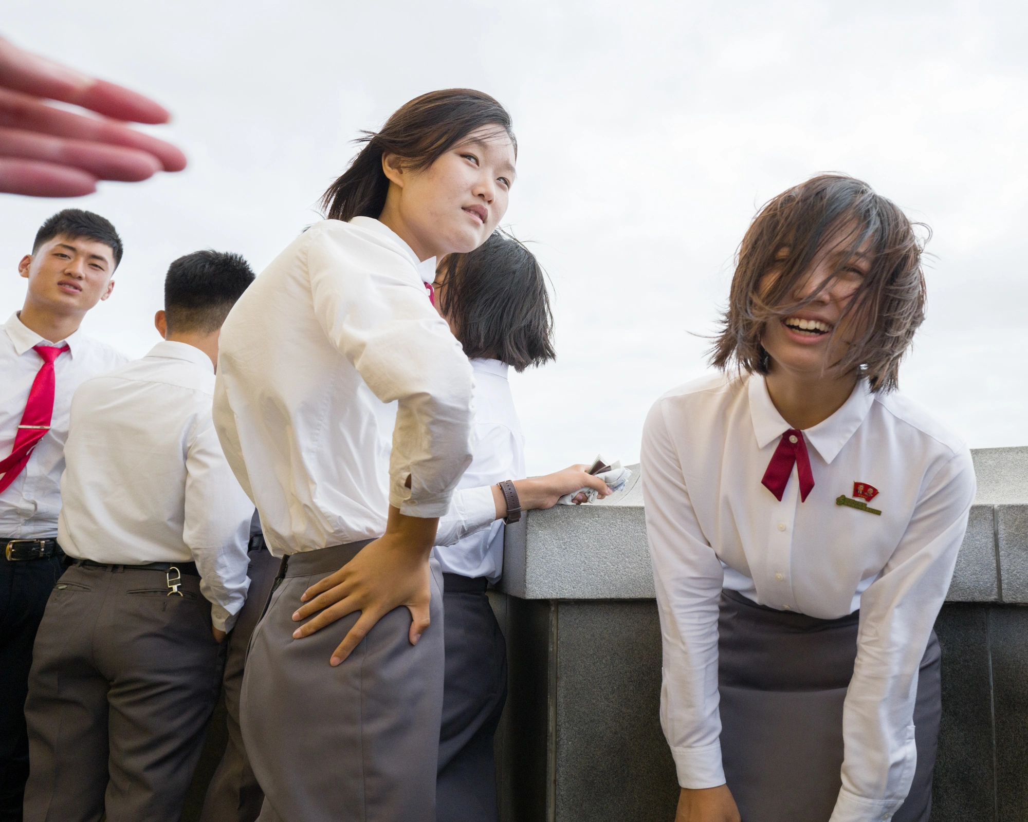 Студенты консерватории шутят и смеются из-за сильного ветра, который сбивает их с ног. Пхеньян, 2024. Фото: Елена Чернышова.