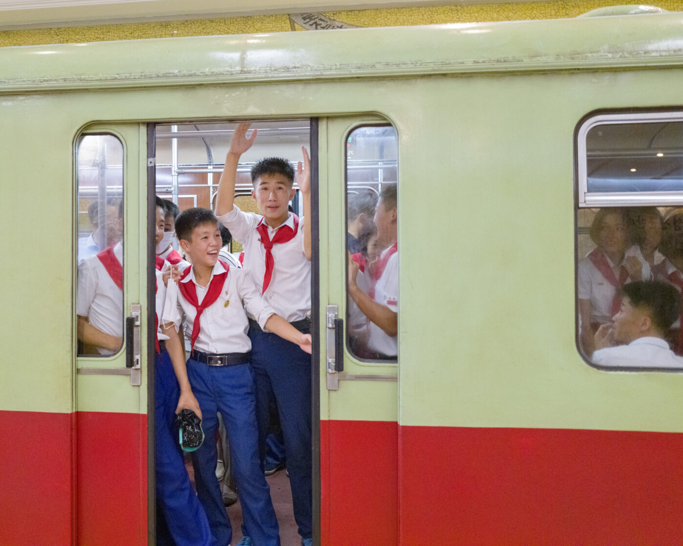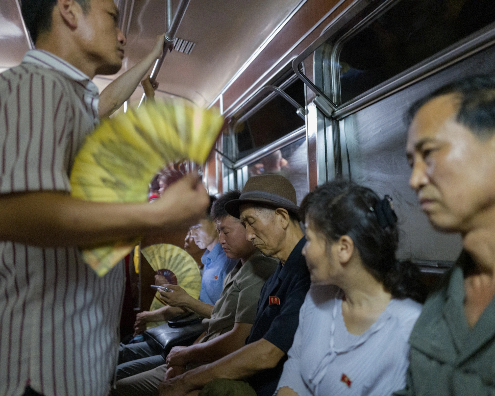 Пассажиры пхеньянского метро обмахиваются веерами из-за сильной жары и влажности в вагоне поезда. 2024. Фото: Елена Чернышова.