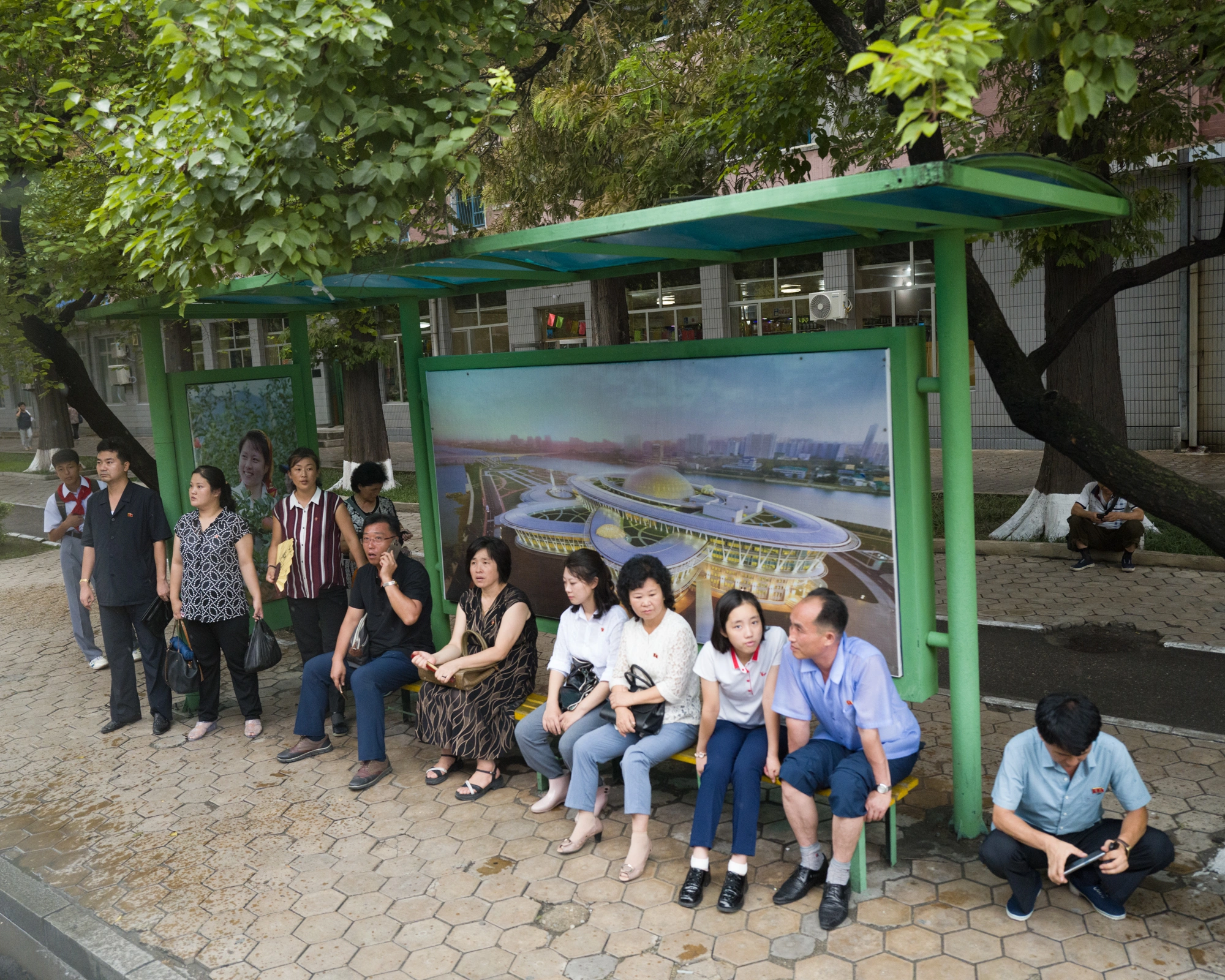 Люди ждут автобус на остановке общественного транспорта в Пхеньяне. 2024. Фото: Елена Чернышова.