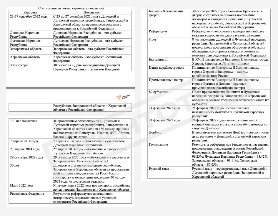 4️⃣ Настольная игра «Возвращение истории» для 8−11 классов. Перед игрой организатор должен распечатать по 25 карточек — каждую в двух экземплярах. Каждая карточка содержит текст на одной стороне (например, «Запорожская область», «8 лет», «24 февраля 2022 года») и пояснение — на другой. Карточки следует разложить на столе. Ученики должны переворачивать их, и когда текст на двух уже открытых карточках совпадет, то прочитать пояснение к нему. Пояснения содержат такие утверждения: «Запорожская область — это субъект Российской Федерации», «8 лет население Донецкой и Луганской народных республик, Запорожской и Херсонской областей подвергалось постоянным обстрелам и жесткому обращению со стороны киевского режима до момента присоединения к Российской Федерации», «24 февраля 2022 года — начало специальной военной операции в ответ на просьбу о помощи со стороны Донбасса» и другое. Такую игру, согласно более ранним отчетам (1,2,3), проводили в школах и в прошлом году.