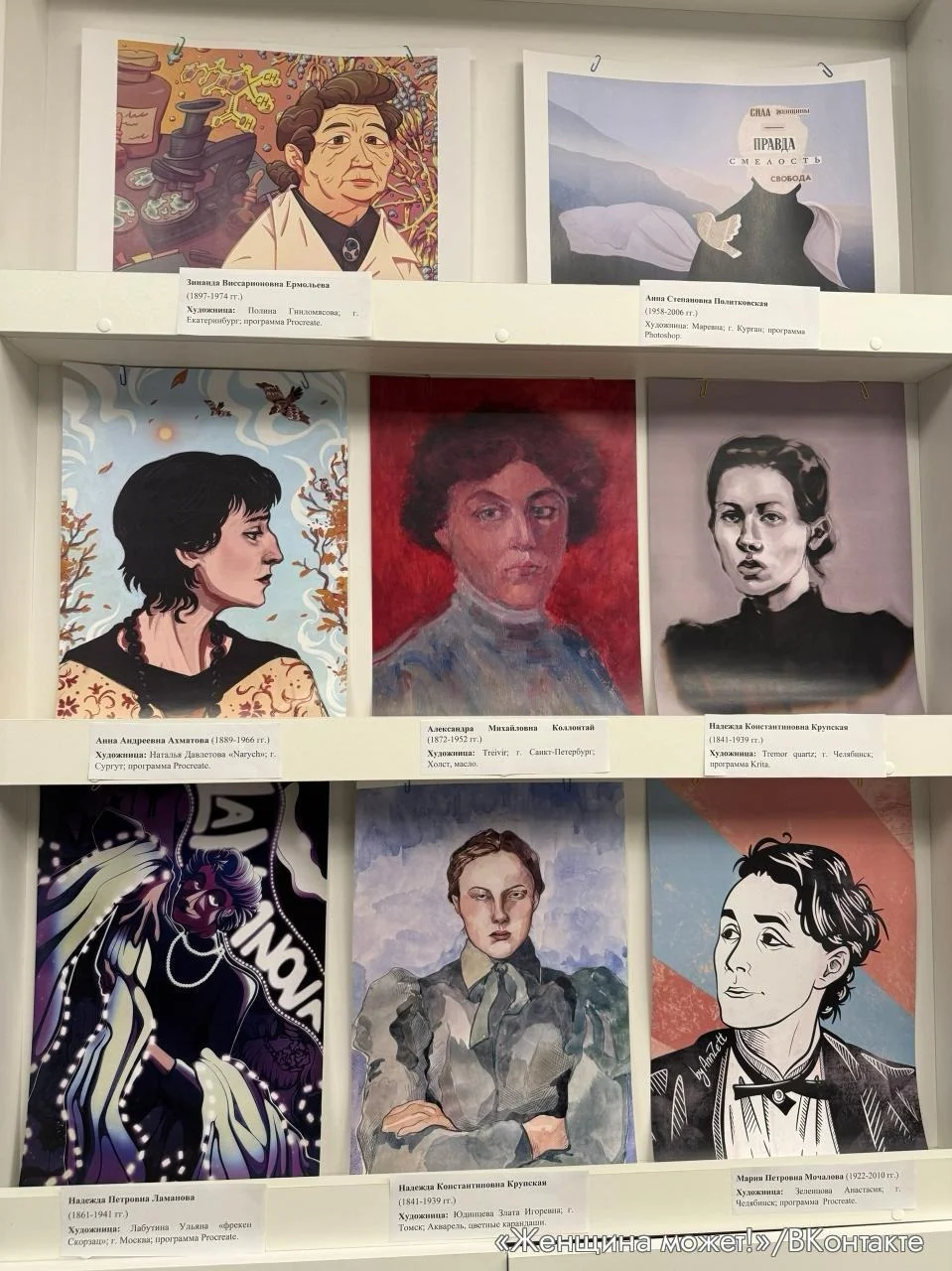 «Женщина, имеющая статус иностранного агента» — это политолог Екатерина Шульман. Среди других работ, представленных в экспозиции, были портреты Анны Ахматовой, Анны Политковской и других.