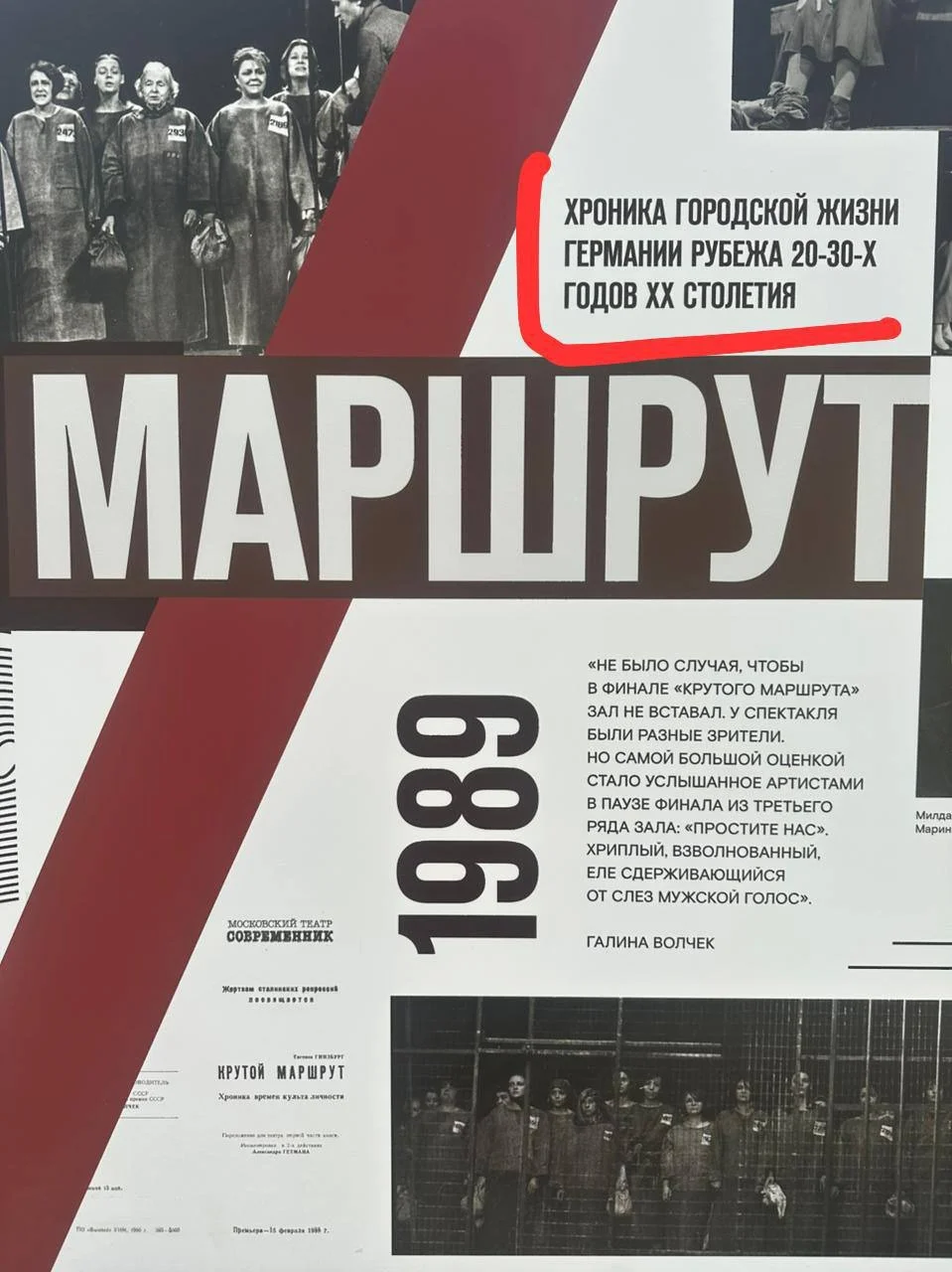 На фотовыставке театра «Современник» перепутали описание спектаклей по книгам Евгении Гинзбург «Крутой маршрут» и «Три товарища» Ремарка. В результате получилось, что спектакль про сталинские репрессии — это «хроника городской жизни Германии рубежа 20‒30-х годов ХХ столетия». Внимание на стенд с ошибкой обратили зрители.