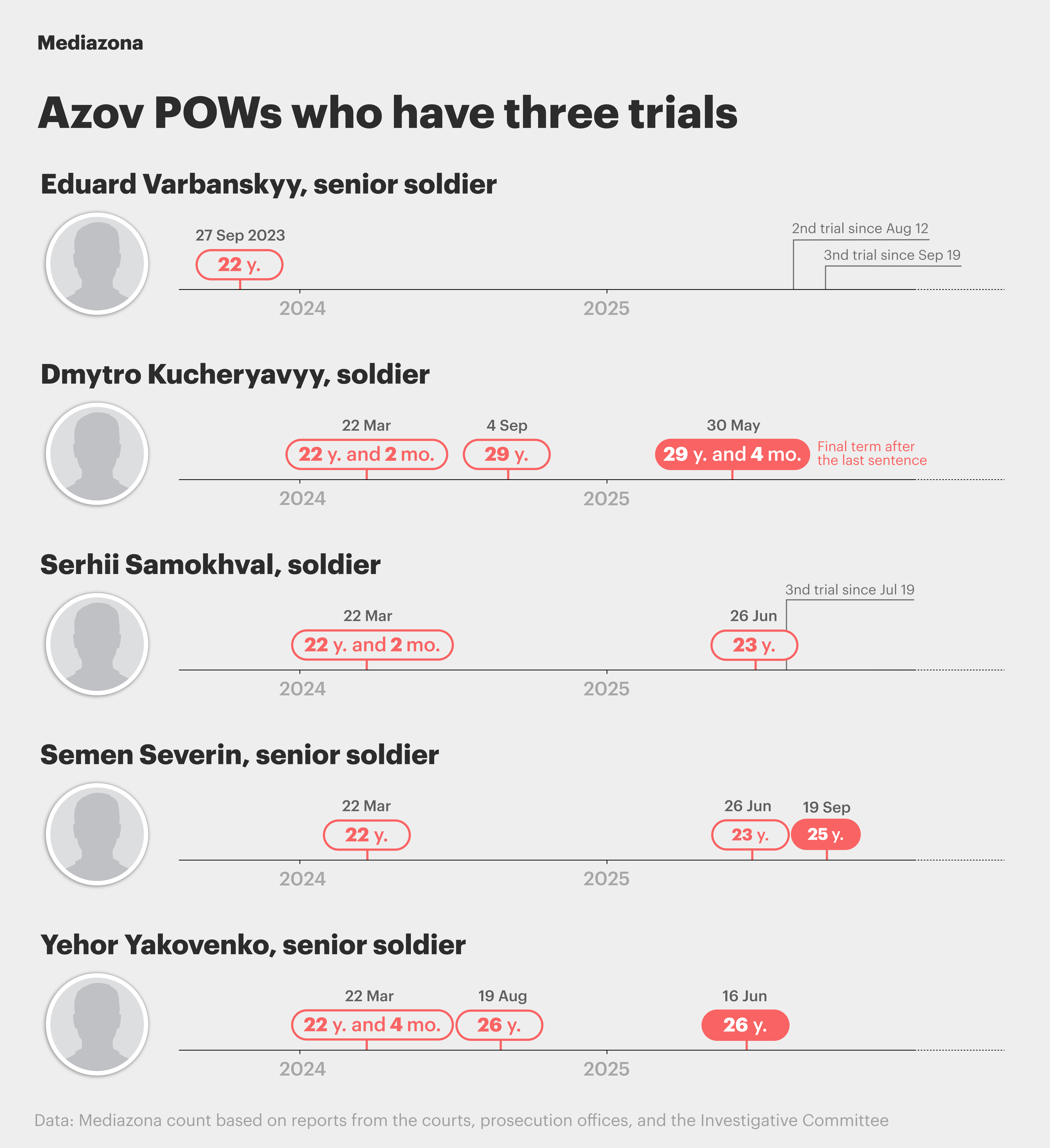 Mediazona is aware of at least six cases where Ukrainian servicemen were tried multiple times in absentia. The criminal prosecution of two prisoners continued even after they were returned to Ukraine in an exchange.