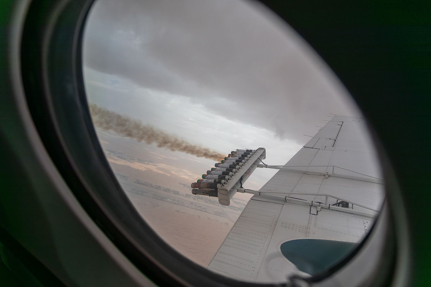 В 13:40 радиолокаторы зафиксировали самолет ВВС ОАЭ с позывным UAF836, летевший на север над Дубаем. Это был Beechcraft King Air — небольшой двухмоторный самолет, используемый для того, чтобы искусственно вызывать дождь — так называемый засев облаков. Его крылья оснащены трубками с десятками ракетных фальшфейеров, содержащих кристаллы соли с наночастицами титана. Когда фальшфейеры поджигаются, частицы соли рассеиваются в облаках, притягивают влагу и помогают образовываться каплям дождя.