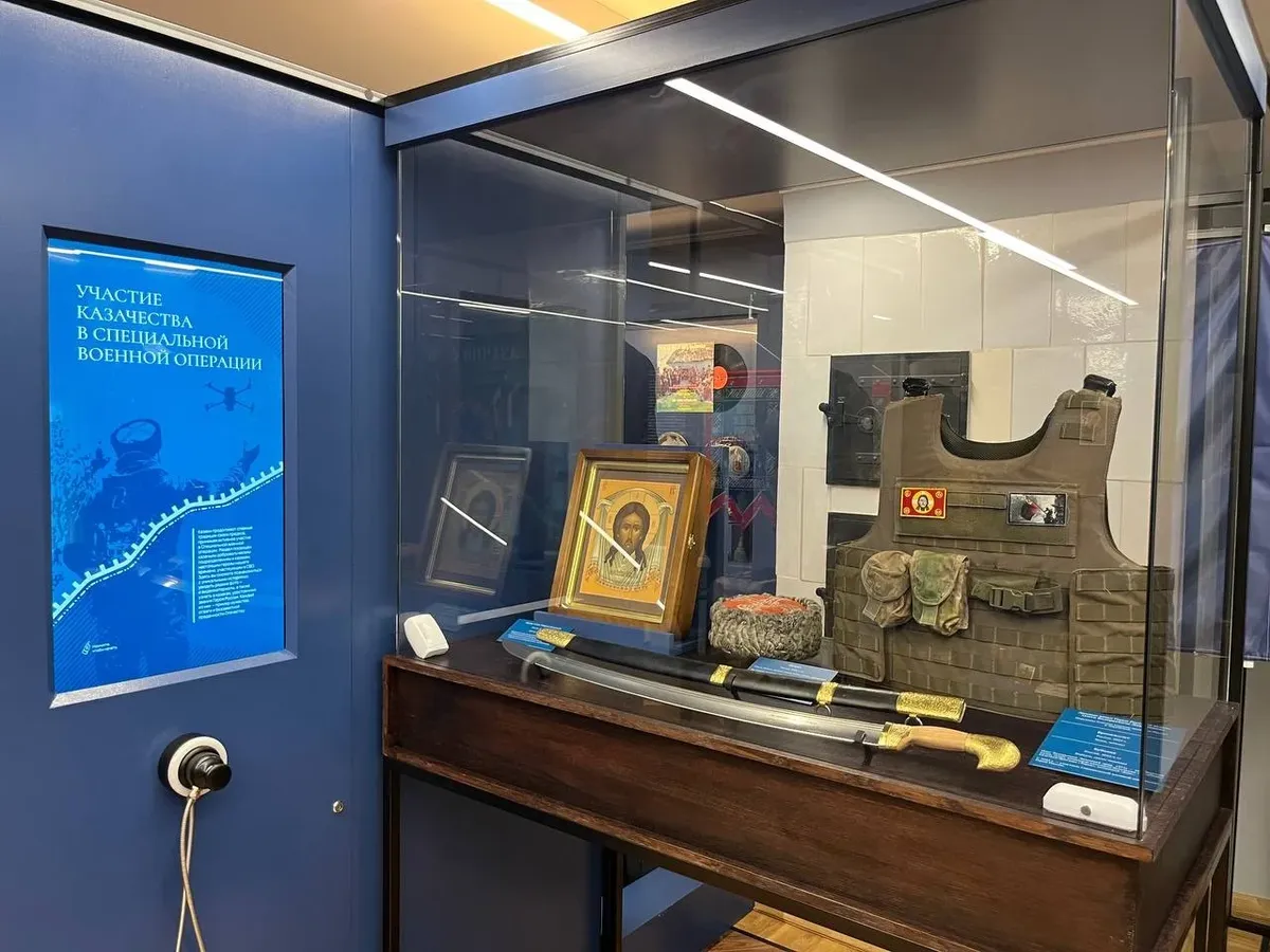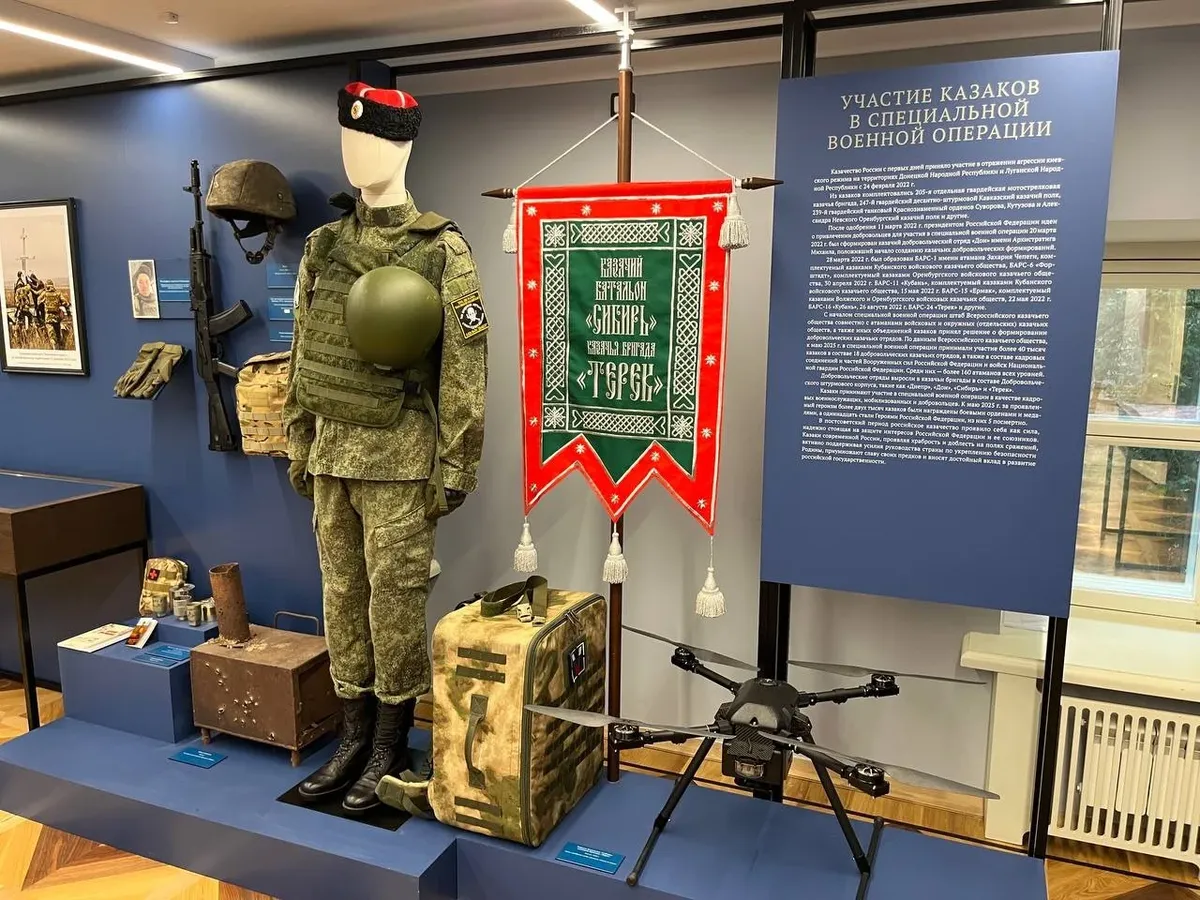 Но это казачкам и станицам еще повезло. Вся полная событиями трагическая история казачества с 1917 по 1940 год уместилась на одном планшете и сведена к сентенциям о «драматическом периоде» и «черных страницах в силу действий обеих сторон». Никаких тебе картинок, документов или подробностей. А потом казачество резко становится «красным» — и все безумно ускоряется так, что промежуток между приказом наркомата обороны о казачьих кавалерийских частях тридцать шестого года и началом экспозиции про участие казаков в специальной военной операции занимает буквально мгновение.