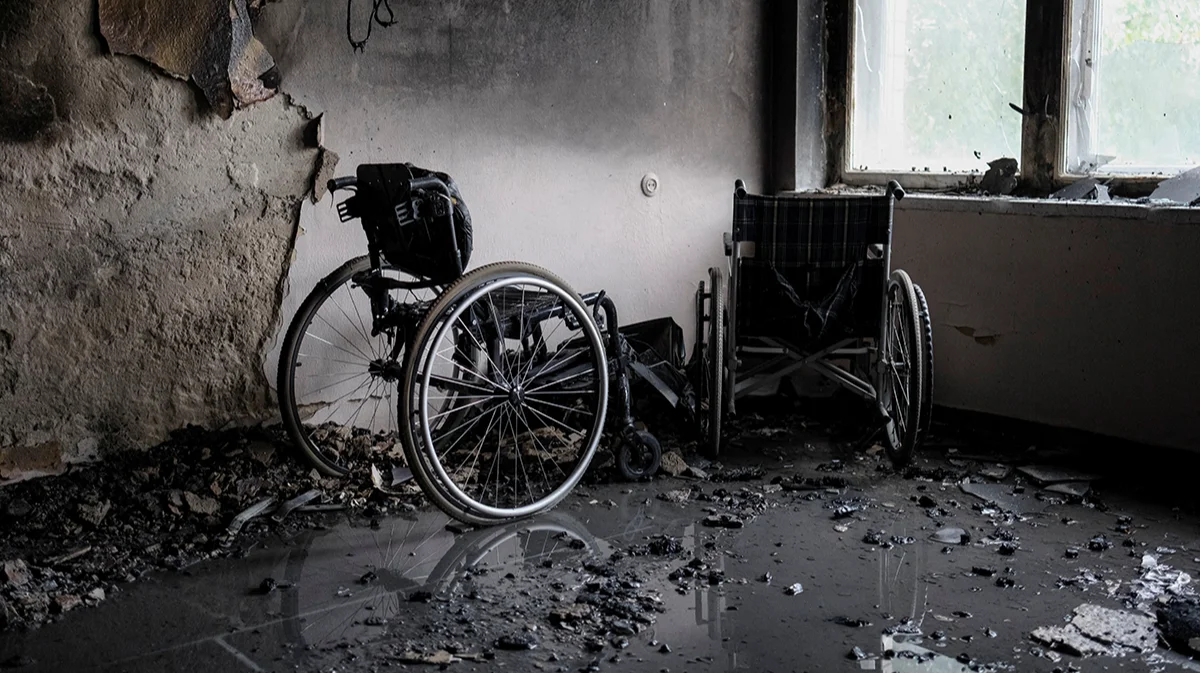 Инвалидные коляски стоят в сгоревшем коридоре кардиологической клиники, пострадавшей во время ударов российских беспилотников, Киев, Украина, 28 сентября 2025 года. Фото: Gleb Garanich / REUTERS / Scanpix / LETA