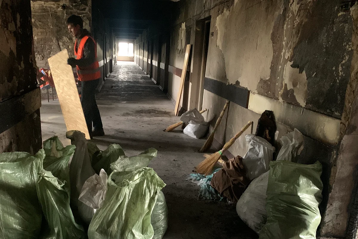 Черные от копоти стены и потолок, гуляют сквозняки. Хотя в горле, как обычно на свежем пожарище, не дерет. Наверное, потому, что ребята в оранжевых жилетах с надписью «Добробат» (волонтерский строительный батальон, который по собственной инициативе появляется вслед за спасателями приводить в порядок после «прилетов» уцелевшее жилье, школы, больницы — всё, до чего дотянулась российская армия) продолжают наполнять мешки, выгребая спекшиеся груды теперь уже строительного мусора. И режут листы фанеры — закрывать оконные проемы.