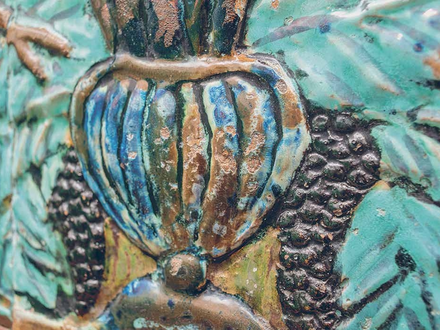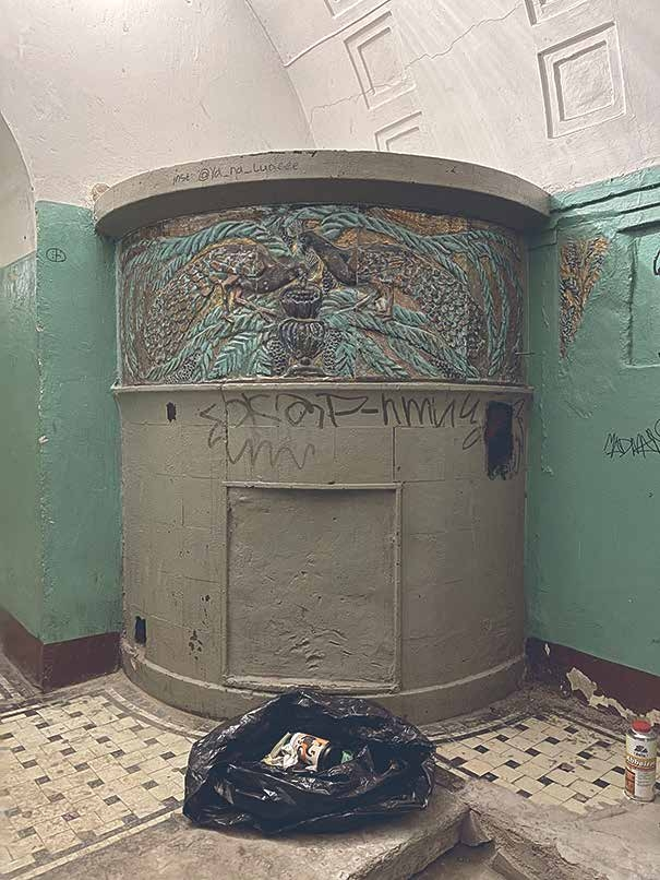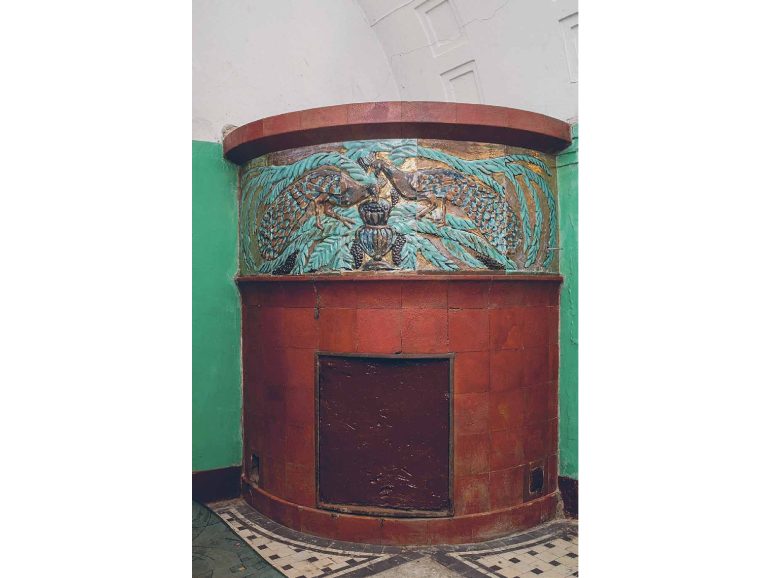 Я ходила мимо него не меньше десятка раз и не замечала, что он вообще-то под краской. Камин венчало относительно чистое майоликовое панно с двумя павлинами на золотом фоне — птицы перетягивали все внимание на себя, и вот изразцы болезненного серо-зеленого цвета уже не так бросались в глаза. Когда-то изразцы камина были закрашены черным, и даже исследователи наследия «Гельдвейна-Ваулина» считали, что этот цвет родной. И вот в январе 2021 года Максим нашел место, где поздняя серо-зеленая краска отслоилась от керамики. Из-под нее выглядывал черничный изразец! Я взялась согласовывать очистку в Комитете по охране памятников и волновалась как никогда: такой камин в городе один, а панно на нем хоть и имеет повторения, но сделано по рисункам самого Михаила Врубеля. Казалось, что если мы отмоем его, то круче уже объекта не найти (потом, конечно, нашли). Комитет отправил сотрудников оценить ситуацию и вскоре прислал положительный ответ. Фух.
