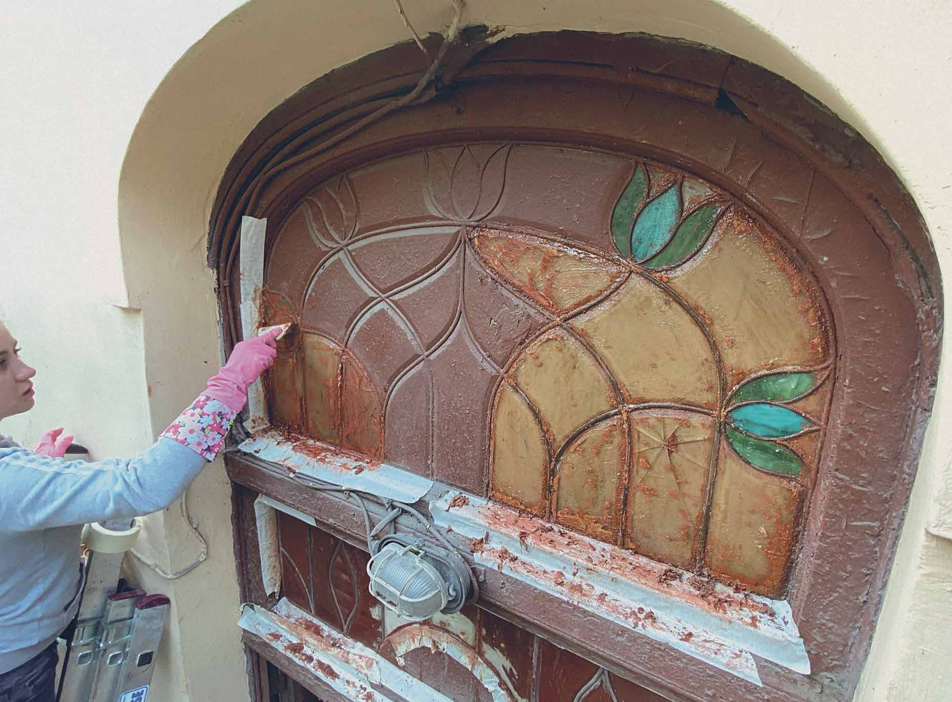 В первый заход работали семь часов — за это время снаружи начерно очистили ⅔ витража. Оказалось, что некоторые стекла в нем битые, дыры кое-как заложены гипсом — под краской этого не было видно и казалось, что сохранность идеальная. Стало интересно, когда стекла могли разбить. Во «ВКонтакте» на личной страничке специалиста по витражам Евгения Иванова, известного своими бездонными архивами в сочетании с редким нежеланием ими делиться, удивительным образом нашлась фотография за 1989 год. Так вот на ней витраж хоть и без краски, но стекол в нем разбито больше! Выходит, за эти годы его кто-то даже чинил, причем профессионально, так что во время очистки с расстояния в пару сантиметров я не увидела разницы между старыми стеклами и новыми. Толщина, угол фацета — все это реставраторы подобрали идеально. Позднее жители рассказали нам о своей соседке. По их воспоминаниям, дама работала реставратором и несколько раз самостоятельно отмывала от краски старинную печь в парадной. Я уже не помню, умерла она или переехала, но сегодня печь цвета первых осенних моховиков снова покрыта слоем краски. Пока — одним. Может, это она и занималась витражом.