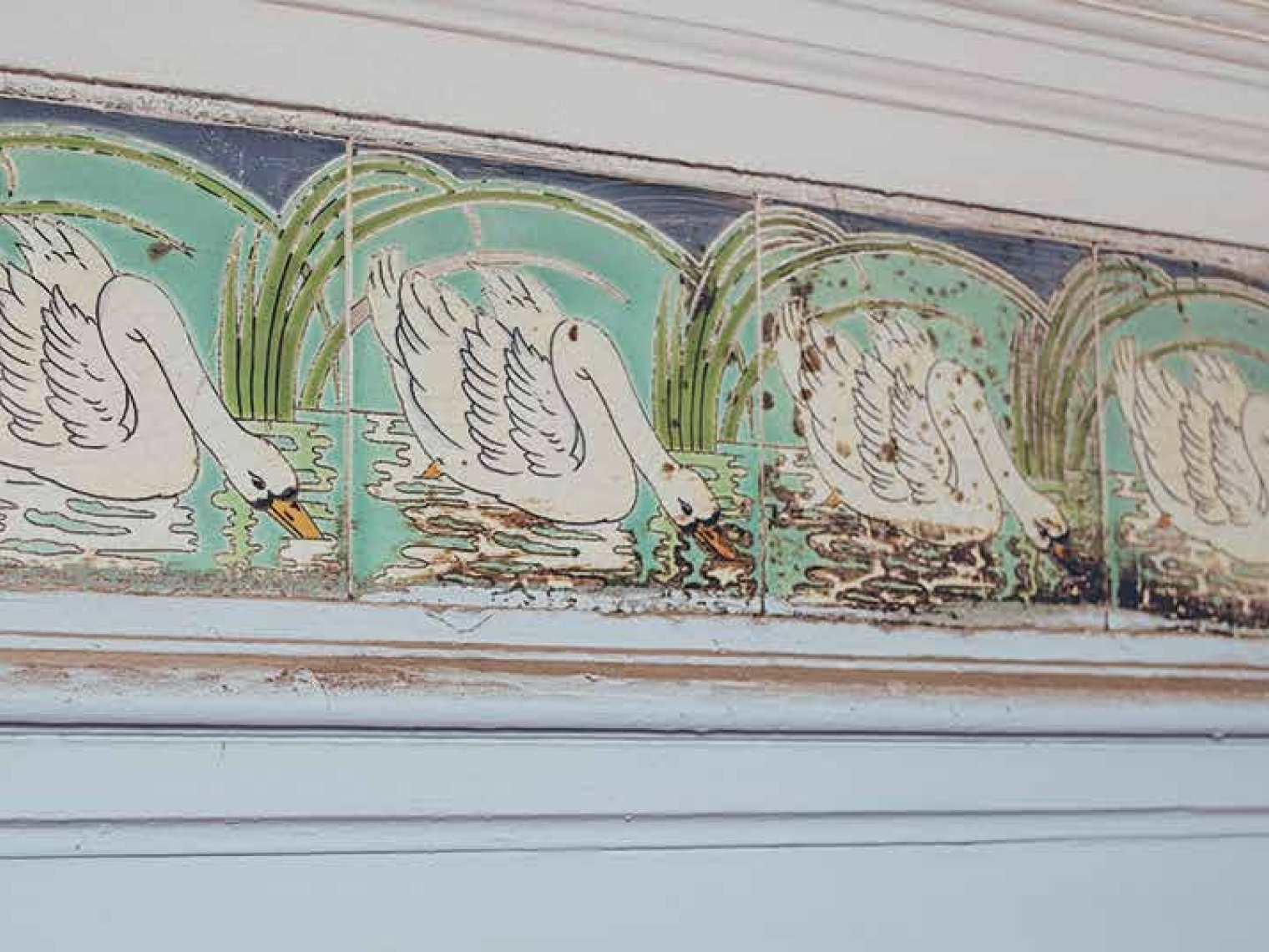 Общество привозило кафель и метлах из Англии, Германии и Франции. Фриз под потолком для города уникален, хотя вообще кафель с лебедями разных конфигураций и степени проработанности делали буквально все — страшно популярный был мотив. Ближайшие известные мне керамические лебеди живут в Выборге, и сделали их немцы. А тут — французы, которых в городе по пальцам пересчитать!