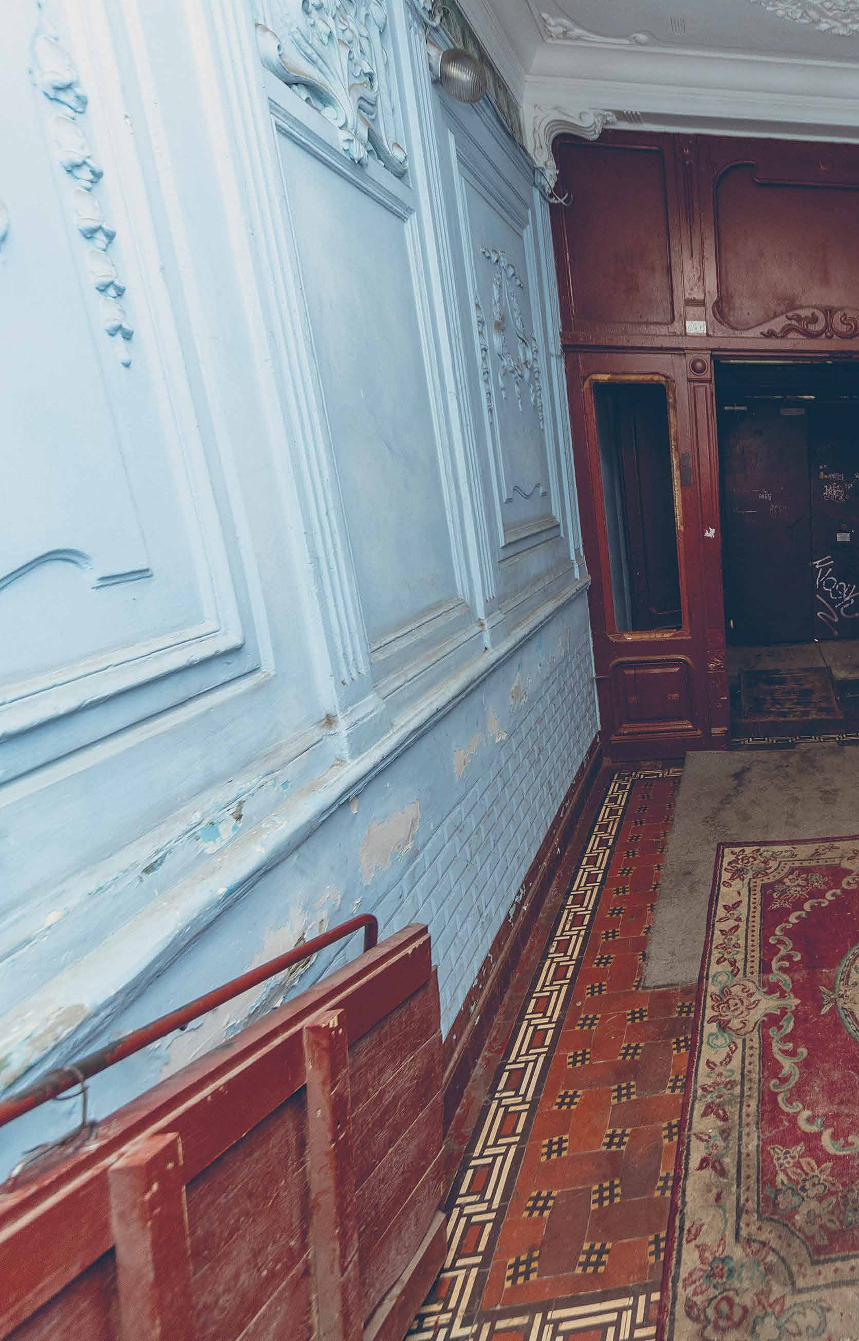 Лебеди не были закрашены, и о них краеведы всегда знали. Это-то и отвлекало меня от того, чтобы посмотреть на стены на уровне коленок — всегда ходила по парадной с задранной головой. А на нижней трети стен под краской таилась толстенькая бирюзовая плитка формы вкусного крепкого шоколадного батончика. Заметила я эту плитку, как обычно, случайно, уже когда глаз поднаторел выхватывать детали. Обрадовалась страшно — легендарный дом, а мы тут свою лепту внесем! Но оказалось, что настоящая работа с этим домом еще даже не началась. И что вот там-то и будет настоящее величие (совсем не только наше).