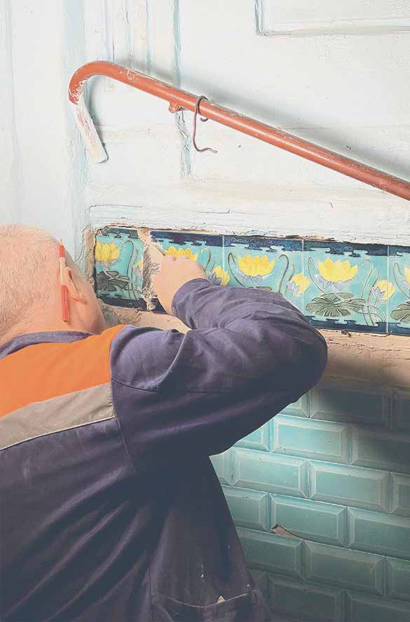 Беглый осмотр показал, что на всю парадную сохранилось всего шесть плиток. Но это же настоящая находка, по керамическим меркам — целая сенсация! Ажитированная, я решила идти ва-банк — немедленно писать директору реставрационной компании «Паллада», известной, например, реставрацией минаретов Соборной мечети в Петербурге — такого вот масштаба проекты. Писала я, конечно же, не просто рассказать о находке, а предложить воссоздать весь плиточный фриз. С директором компании Константином Лихолатом мы были представлены друг другу, поддерживали беседу на тематических событиях и дружили в соцсетях, он был приглашенным экспертом на первом «Крайконе», но не больше. Поэтому я не особо надеялась, что он впишется в дорогой, долгий и сложный проект. Но Константин оказался онлайн, моментально прочитал сообщение и в ту же минуту согласился.