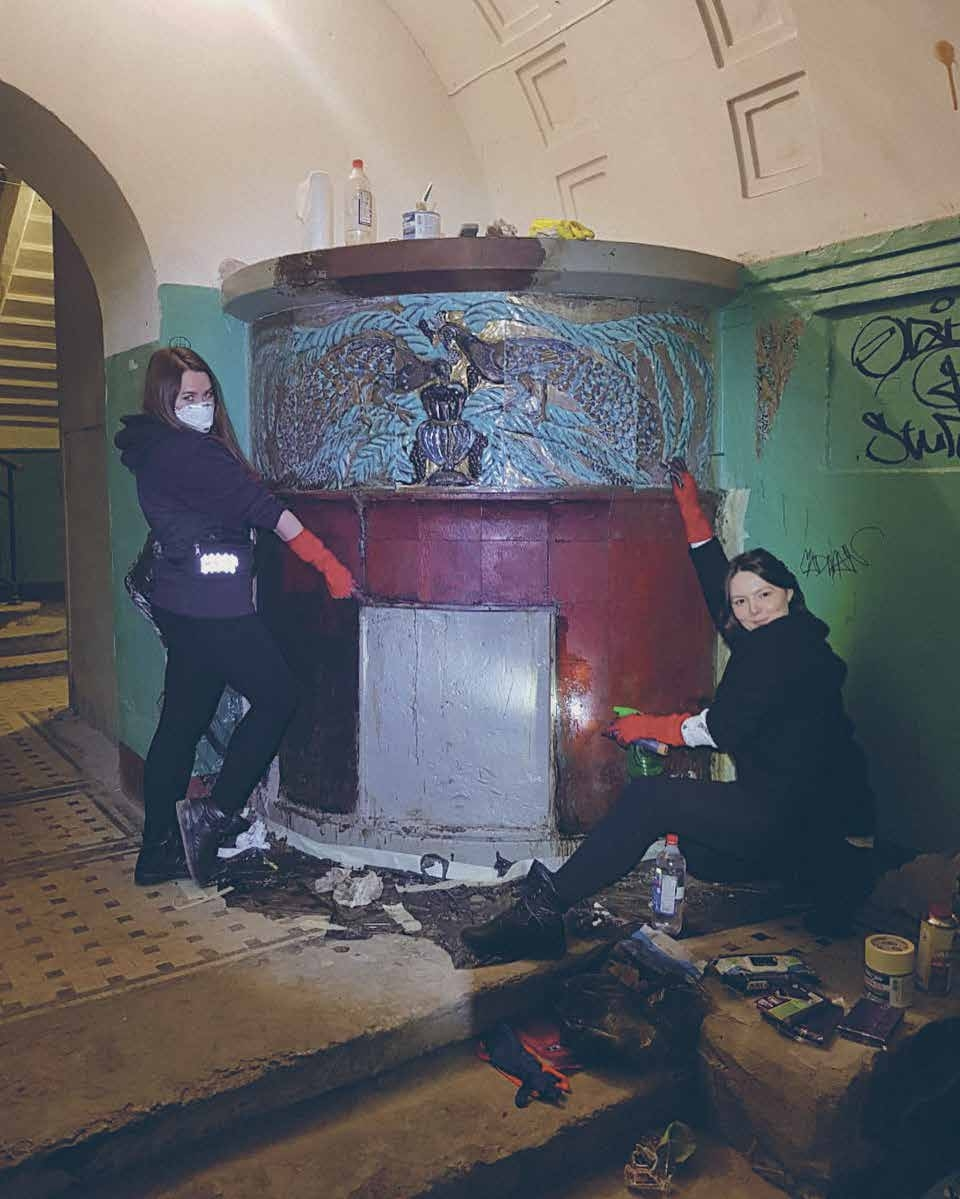 Стали чистить по много часов подряд — то каждый день, то через день. Примерно спустя неделю после начала работ мнения жителей разошлись. Был господин, который воодушевленно рассказывал о доме и приговаривал: «Вот по вам видно, что вы хорошая молодежь, а не те, кто на митинги выходят!» Одна дама поила команду свежесваренным кофе в крошечных красивых чашках с серебряного подноса и приносила шоколадные конфеты. Но была и другая дама, ее слова меня сильно задели, — она бежала из парадной на улицу и крикнула нам: «Живо поднимитесь на каждый этаж и откройте все окна!» Я оторопела от приказного тона и спросила, почему же она не сделала этого сама, раз спускалась по лестнице. Она ответила: «Ты должна! Будешь еще так со мной разговаривать во время работы, соплячка». А я тут не на работе. Я тут в свободное время, зимними вечерами, когда на улице −17 °C, бесплатно, раздобыв деньги у спонсоров на материалы. И мне тридцать лет, я даже не в два раза младше собеседницы. Дама убежала, Кирилл пошел открывать окна. Только спустя несколько минут я обрела дар речи. К этому времени я твердо решила завтрашним же днем познакомиться с дворником дома, в котором я живу. Если так досталось мне, принятой за коммунальщицу, то каково бывает ему? Хасан, кстати, оказался очень общительным человеком с хорошим чувством юмора и твердыми взглядами на жизнь. Теперь мы дружим.