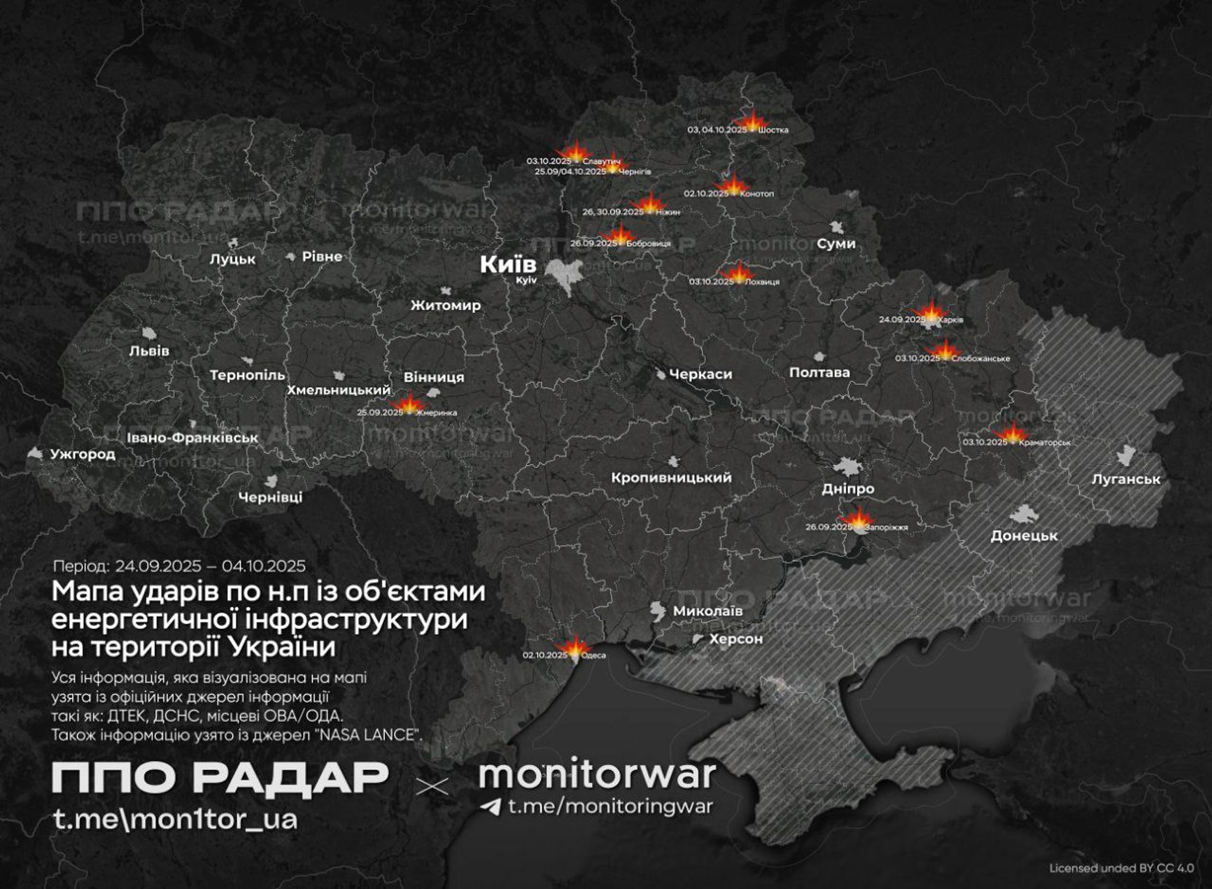 По информации украинских мониторинговых каналов на 4 октября, за 10 дней были атакованы как минимум 13 энергетических объектов по всей Украине, особенно в прифронтовых городах.