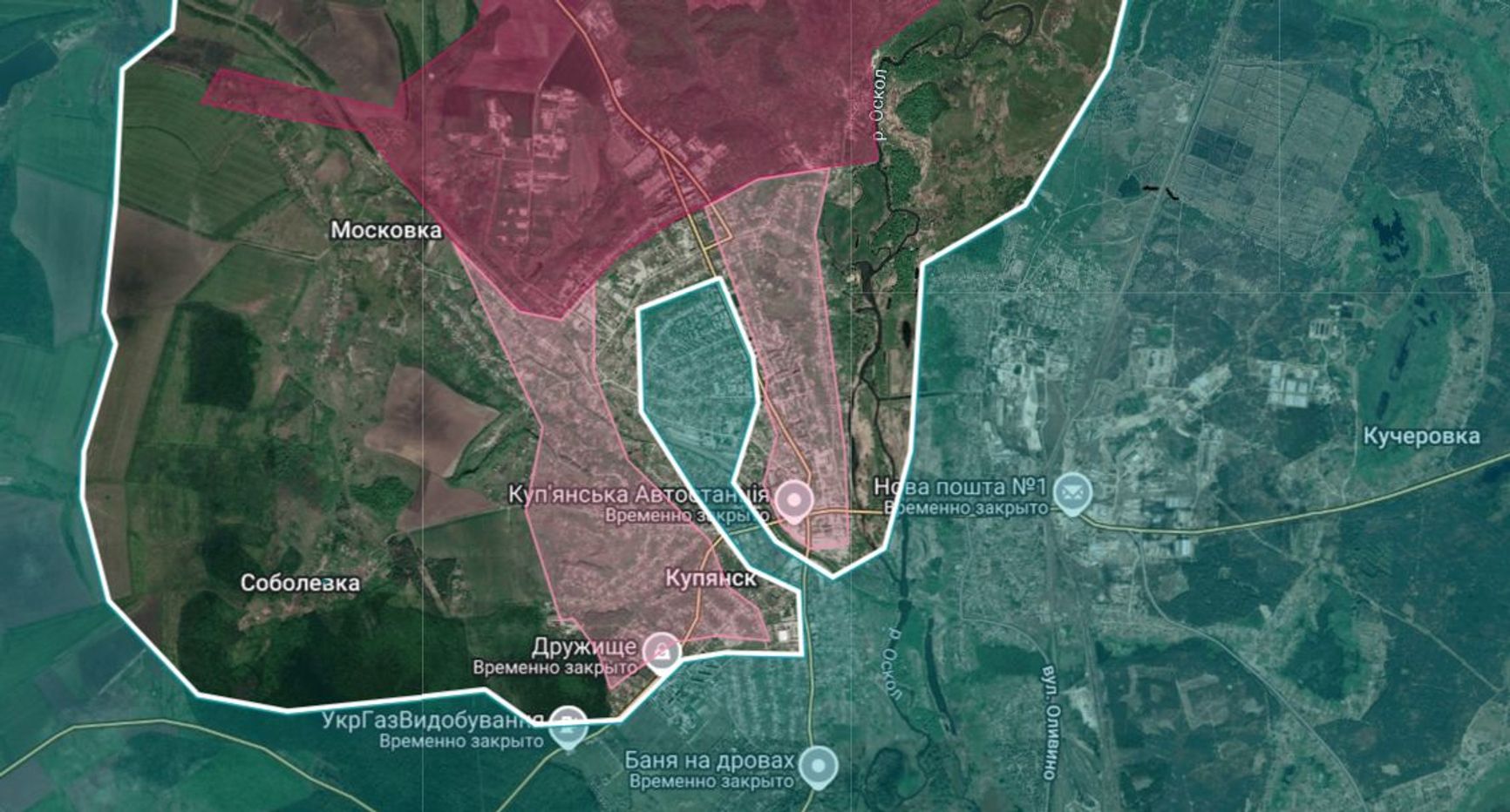 «Военкор» Юрий Котенок пишет о дальнейшем продвижении ВС РФ в Купянске и практически полном окружении части украинского гарнизона в правобережной (западной) части города. Эту информацию подтверждает российский военблогер Анатолий Радов, публикуя свою версию карты обстановки в Купянске. Одиозный пророссийский военблогер Юрий Подоляка отмечает, что в Минобороны РФ уже заявляли о блокировании украинских военных в Купянске, после чего об их судьбе не сообщалось. В то же время он признает наличие успехов ВС РФ в городе.