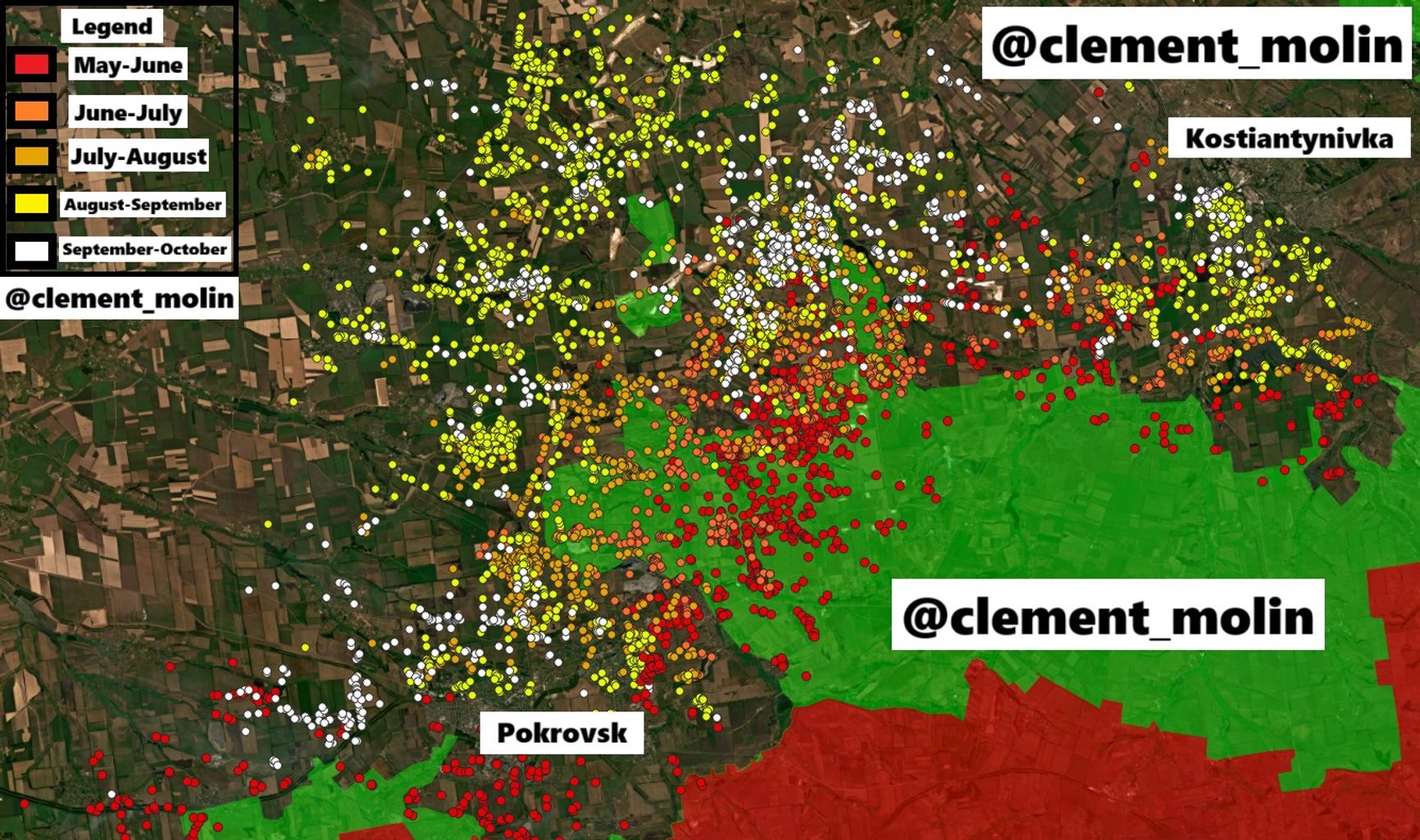 OSINT-исследователь под ником Clément Molin отмечает, что сообщение между «котлами», в которых оказались российские военные на Добропольском выступе, не перекрыто, но крайне затруднено необходимостью преодолевать украинские ИФС и открытые участки местности. Примерную конфигурацию подконтрольной ВС РФ территории он определяет по участкам, где отсутствуют следы российских авиаударов на спутниковых снимках от сентября и октября. По его подсчетам, за последний месяц количество авиаударов на этом участке фронта снизилось почти вдвое, причем они сконцентрированы в районе Шахова, у основания выступа.