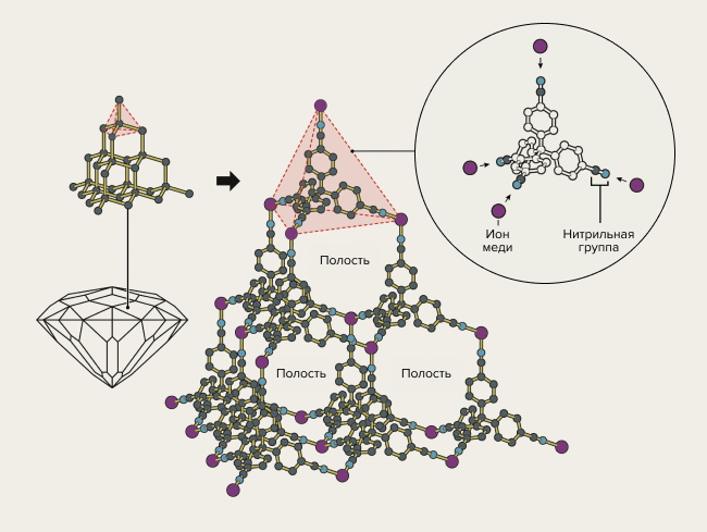 Главным из этих блоков должно было стать вещество с центром в виде одного атома углерода, к которому с четырех сторон, точно как в алмазе, присоединялись бы специальные «ручки» с химическими группами, способными захватывать ионы меди (нитрильными группами, —C≡N). Медь, в свою очередь, соединяла эти тетраэдрические блоки друг с другом. В итоге должно было получиться соединение, сильно напоминающее алмаз по общей геометрической структуре, но построенное из совсем других базовых блоков. А главное, огромную часть объема в нем занимали поры — настолько крупные, что в них могли бы поместиться молекулы других веществ.