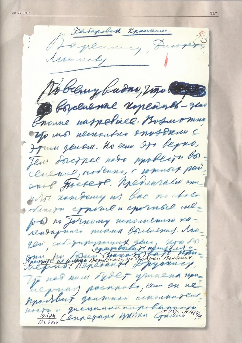 «По всему видно, что выселение корейцев — дело вполне назревшее. Возможно, что мы несколько опоздали с этим делом. Но если это верно, то необходимо как можно быстрее провести выселение, особенно с южных районов Посьете (так назван залив Посьет. — П. Г.). Предлагаем каждому из вас по своей области строгие и срочные меры по точному выполнению календарного плана выселения. Людей, саботирующих дело, кто бы они ни были, арестовывать немедля и наказывать примерно. Арестуйте не только Вольского, но десятки Вольских. Передайте Друскису, что над ним будет учинена примерная расправа, если он не проявит должной исполнительности и дисциплинированности.