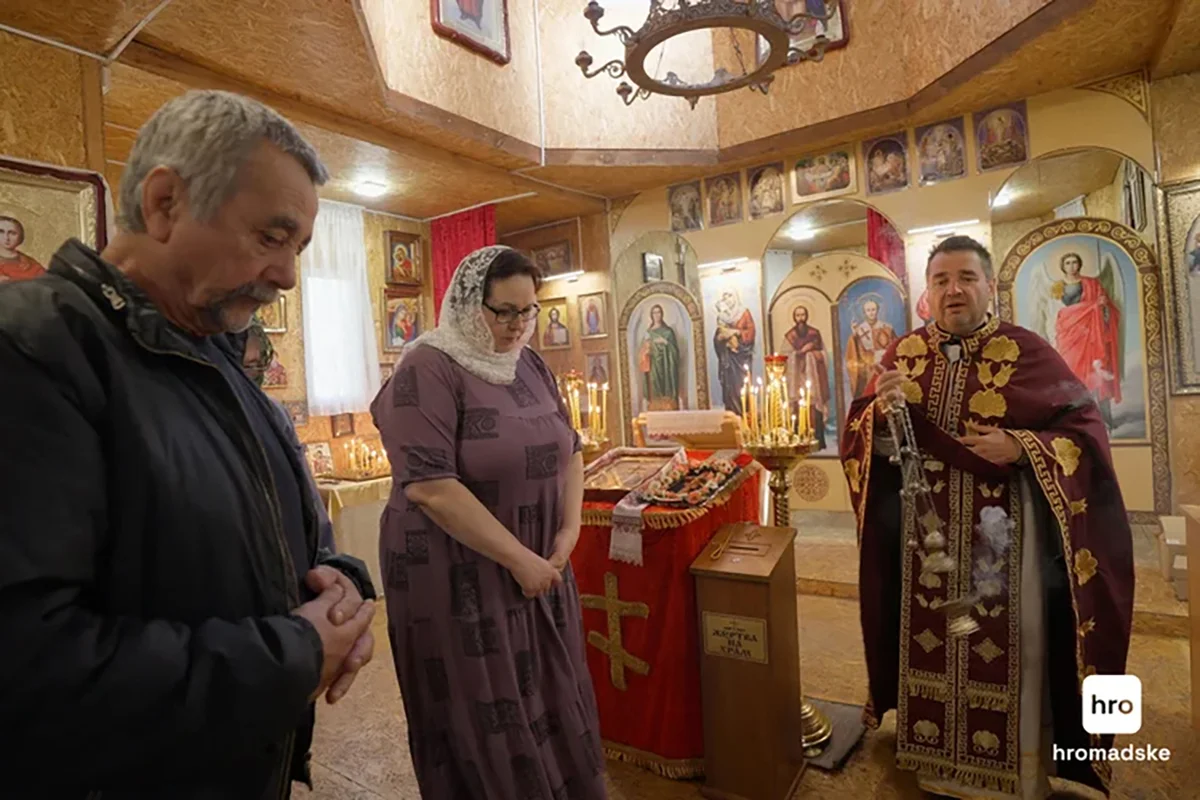 «Помолимся! — говорит священник. — За освобождение Украины от российских оккупантов. За освобождение Украины от власти олигархов, коррупционеров, взяточников. За выявление и ликвидацию всех московских агентов, коллаборационистов, предателей. За прекращение существования империи зла, террористической организации — так называемой “Российской Федерации”. За освобождение пленных, за исцеление раненых, за охрану каждого воина от всякого зла, особенно от смертоносной раны, за наших воинов, за наше войско, особенно за тех бойцов, которые сейчас находятся в тяжелых боях...»