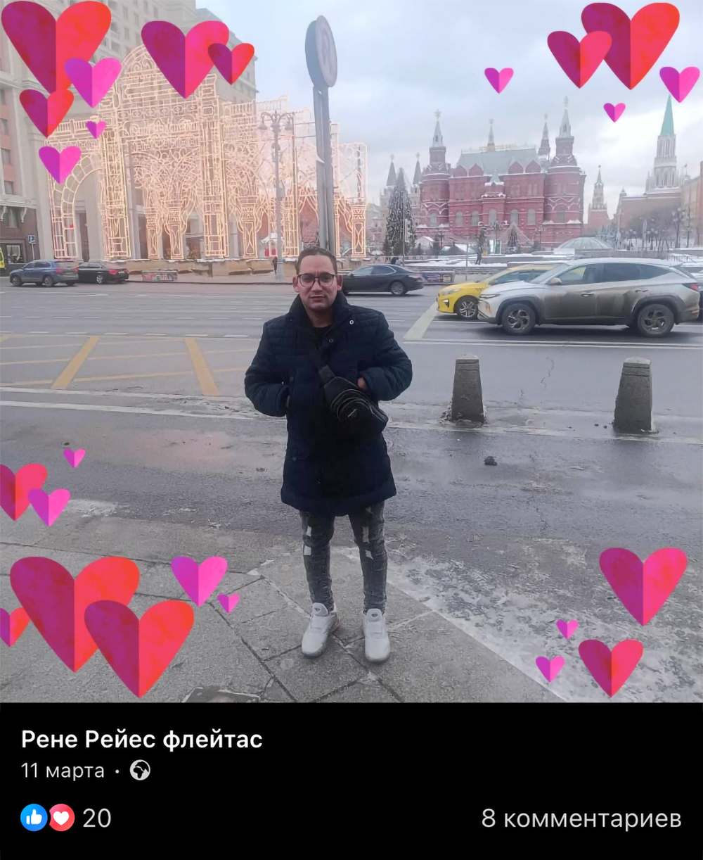 В утечках российских баз данных "Система" обнаружила сведения о трех людях, которые обратились в рязанскую полицию с заявлением на Смирнову. Заявления датированы 25 и 26 апреля 2024 года. Все заявители – граждане Кубы, зарегистрированные по рязанским адресам. У одного из них, Рене Рейас Флейтаса, есть аккаунт в фейсбуке – последняя фотография в нем датирована 11 марта, там он стоит в центре Москвы на фоне Кремля.