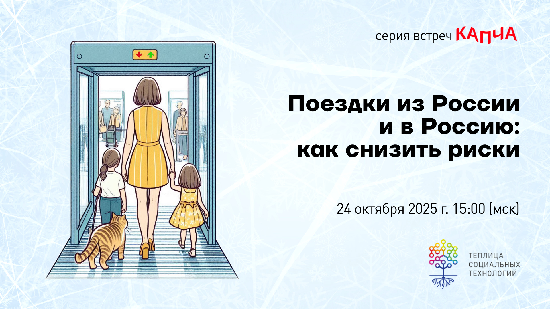 24 октября 2025 года в 15:00 (GMT+3) Теплица социальных технологий проведет интерактивную встречу из серии «Капча» по теме «Поездки из России и в Россию: как снизить риски». Мероприятие адресовано гражданским активистам, журналистам, волонтерам и всем, кто обеспокоен вопросами безопасности как в России, так и в других странах.