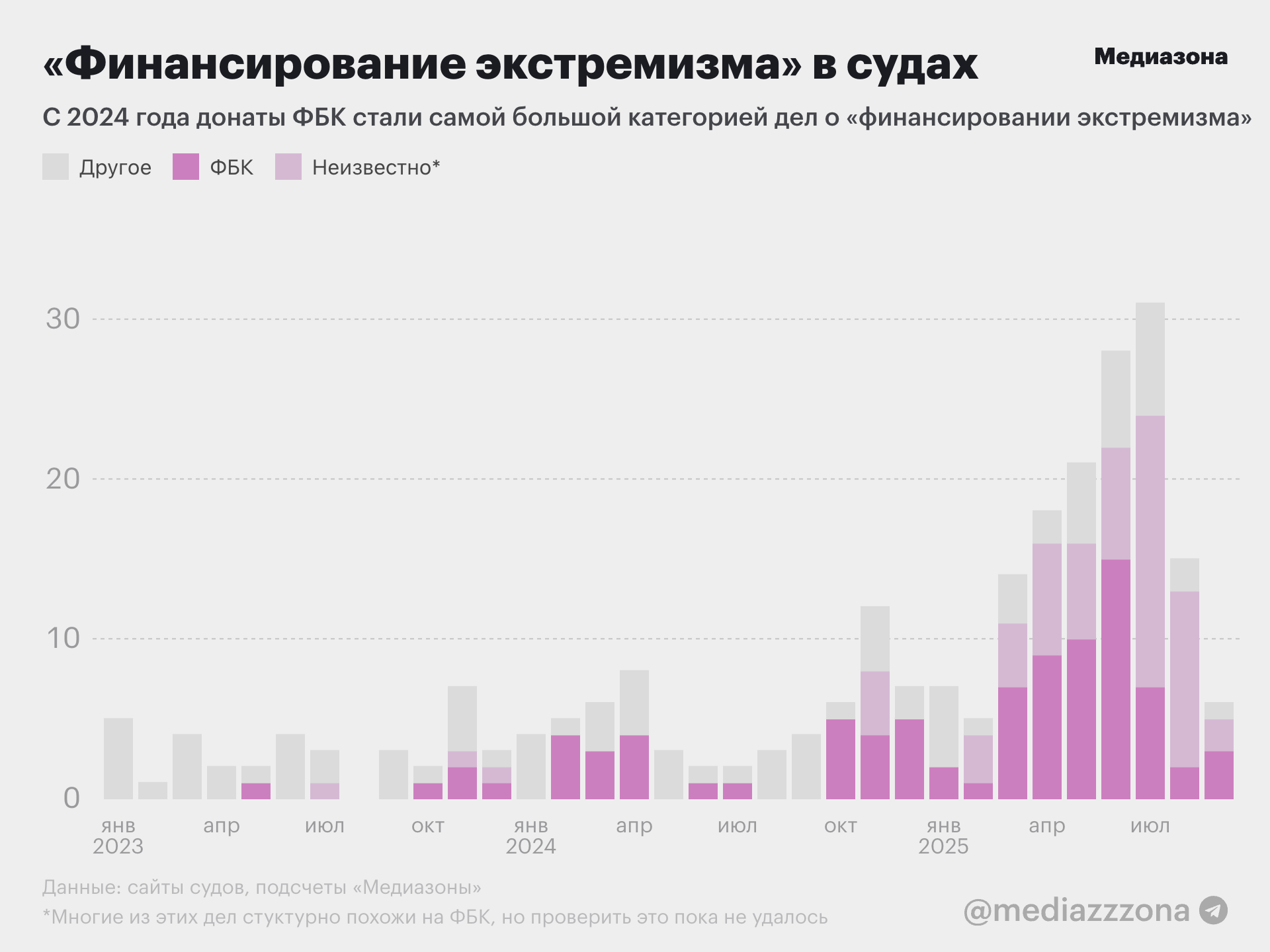 В 2022 году таких дел было всего два, в 2023-м — четыре, в 2024-м — уже 27. В 2025 году мы обнаружили в судах 55 уголовных дел о донатах ФБК.