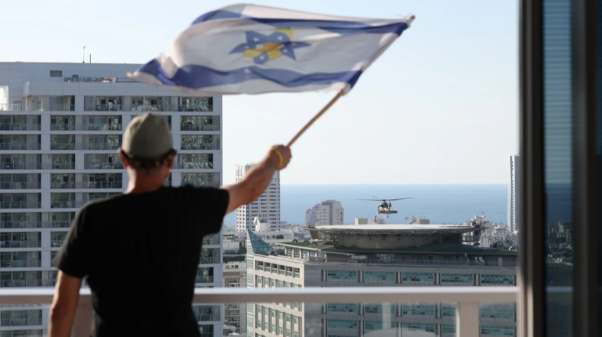 Мужчина машет израильским флагом с балкона, когда к вертолётной площадке больницы Ихилов подлетает вертолёт с освобожденными из плена ХАМАС заложниками, Тель-Авив, Израиль, 13 октября 2025 года. Фото: Abir Sultan / EPA