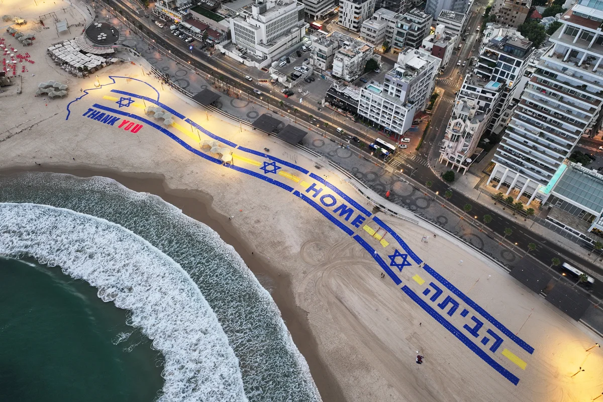 На набережной Тель-Авива появилась огромная надпись, которая начиналась от посольства США и простиралась к югу города в сторону Яффо. И всего одно слово — «Спасибо». А следом надпись на иврите и английском — «Домой» — приветствие заложникам, которые возвращались.