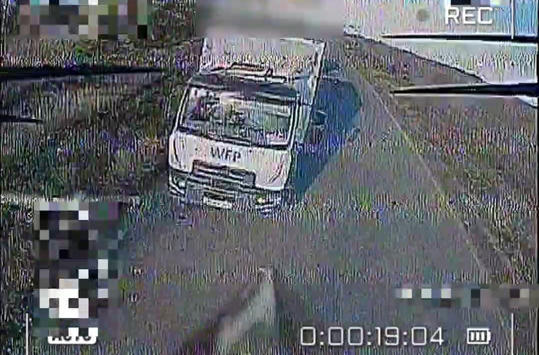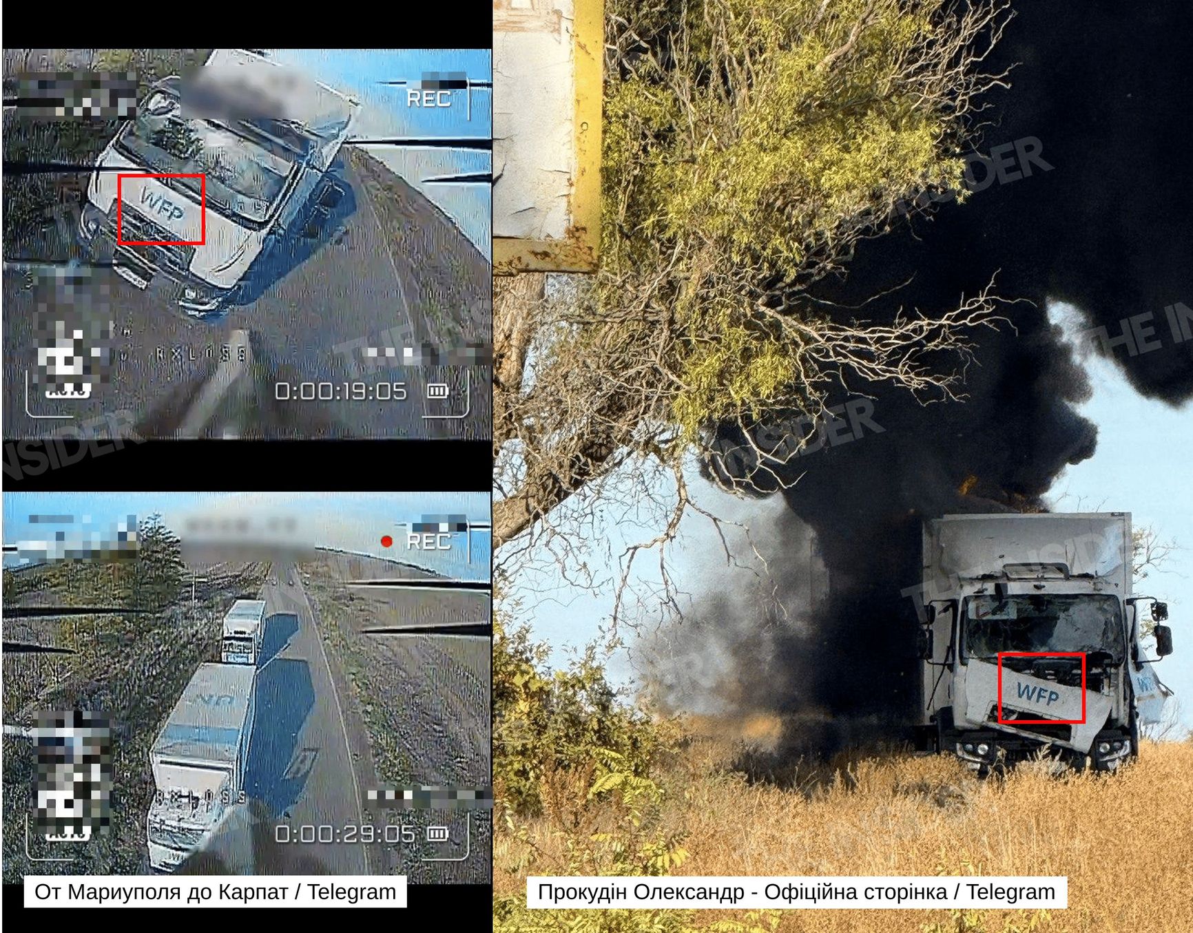 The fact that the video shows an attack on a convoy from the UN Office for the Coordination of Humanitarian Affairs is confirmed upon closer frame-by-frame examination. The truck targeted by the drone bears the inscription WFP — the abbreviation for the World Food Programme. On top of the trucks, the UN abbreviation is also visible, marking them as United Nations vehicles.