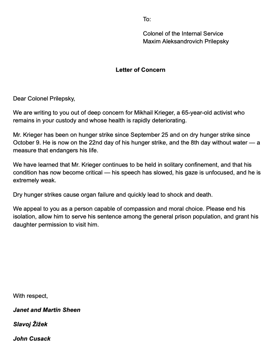 Супруги Шин, Кьюсак и Жижек напоминают, что Кригер держит голодовку с 25 сентября, а воду не пьет с 9 октября. «Нам стало известно, что Михаил Кригер продолжает содержаться в одиночной камере, и его состояние стало критическим: речь замедлена, взгляд расфокусирован, он крайне ослаблен. Сухая голодовка вызывает отказ органов и быстро приводит к шоку и смерти», — напоминают подписанты.