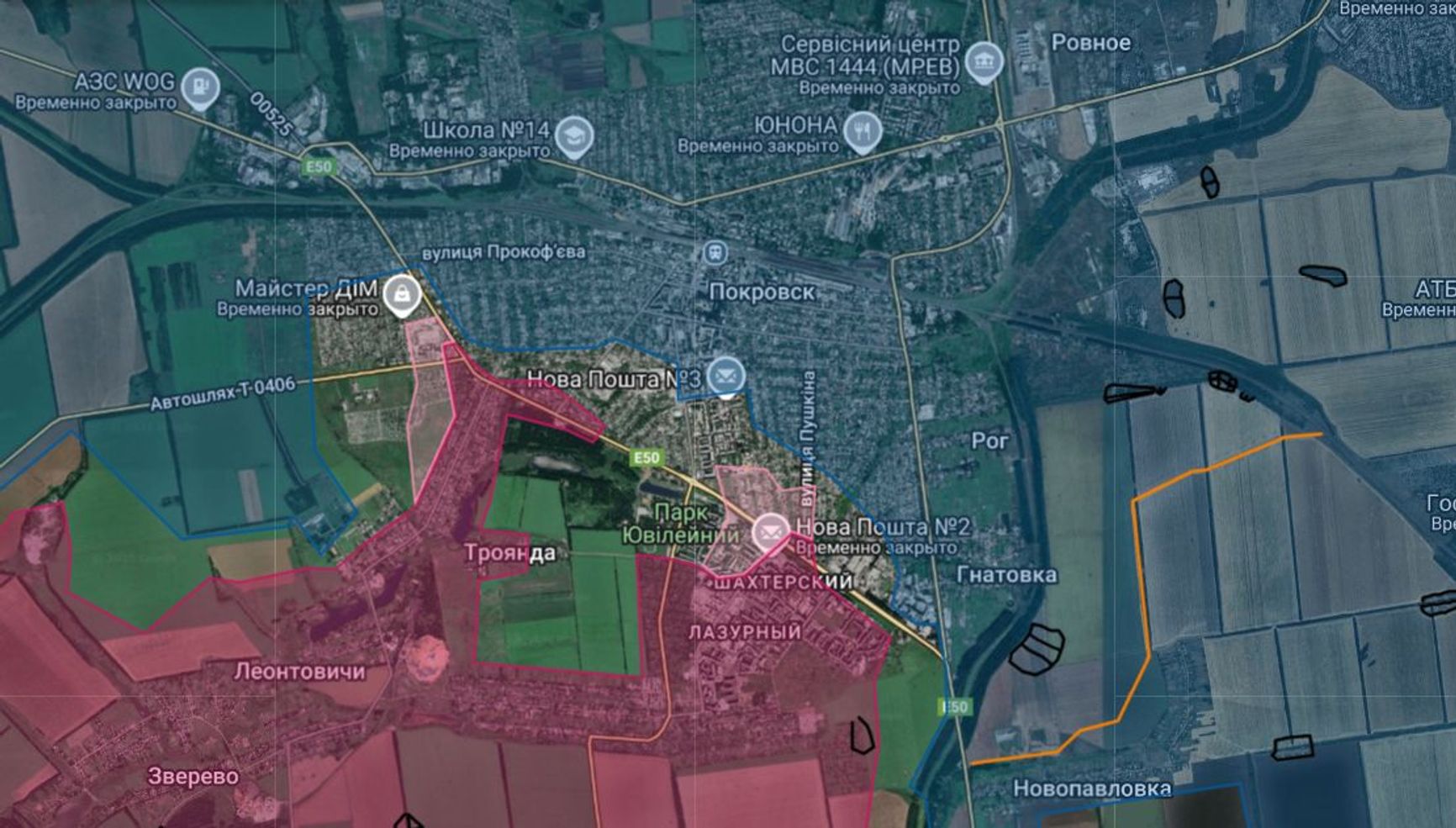 «Военкор» Котенок сообщает о боях на юго-западном охвате Покровска, в жилой застройке самого Покровска и на восточных окраинах Мирнограда (до 2016 года — Димитров), а также за Родинское на трассе Покровск — Доброполье. Пророссийский военблогер Анатолий Радов также сообщает о расширении зоны контроля ВС РФ в южной и юго-западной части Покровска.