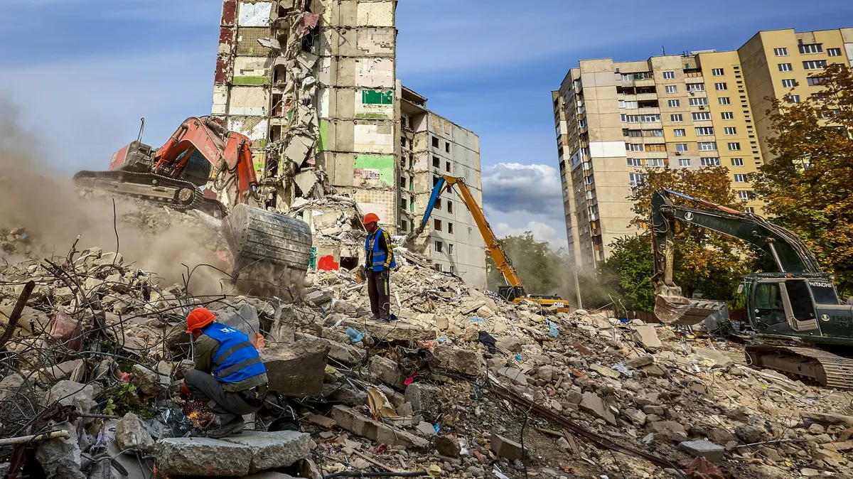 Ukrainian workers demolish residential buildings critically damaged by Russian airstrikes in Kharkiv, northeastern Ukraine, 29 September 2025. Photo: EPA/Sergey Kozlov