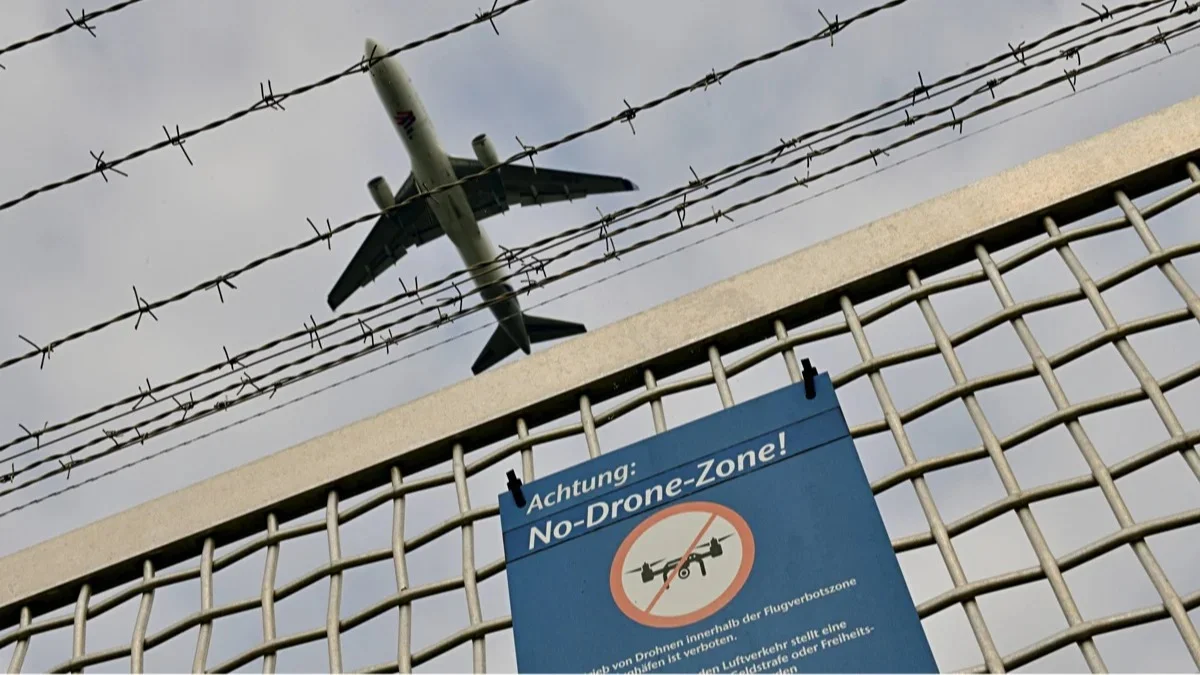 A sign on the perimeter fence at Germany’s Frankfurt-am-Main Airport banning the use of drones, 11 October 2025. Photo: Fraport / Hessen / dpa / Scanpix / LETA