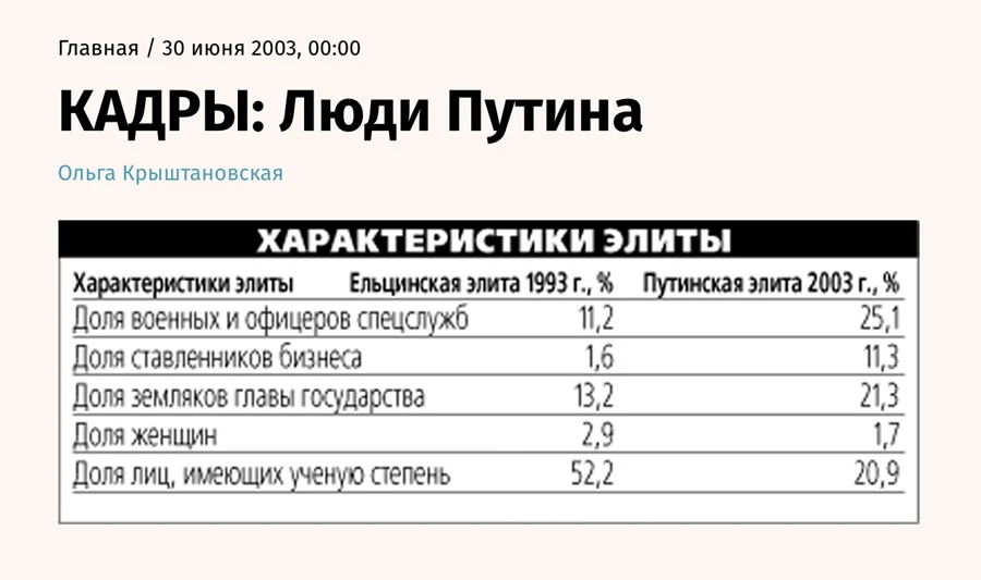 . Основанная на этом исследовании колонка «Люди Путина», написанная Крыштановской для газеты «Ведомости», наделала много шума. «За три года президентства (Путина) российская элита изменилась принципиально, — писала Крыштановская. — Коридоры власти наполнились людьми в погонах». Она сравнила число силовиков в управлении с показателями 1993 года. Получилось, что представительство офицеров различных силовых ведомств среди чиновников при Путине увеличилось заметно больше, чем вдвое (составив 25,1% от общего числа изученных профайлов).