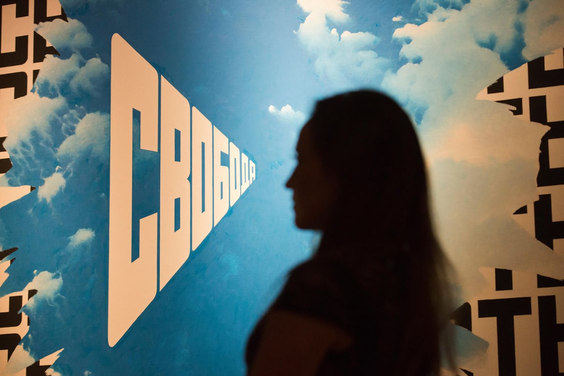 Знаменитая «Слава КПСС» (1975) — воплощение этого конфликта. Агрессивные красные буквы — своего рода решетка или сеть, наброшенная на зрителя и не дающая ему всмотреться в небо. В «Знаке качества» (1986) важен золотой цвет, традиционно символизирующий сакральное. Главное политическое обвинение художника к тоталитаризму заключается как раз в этом.