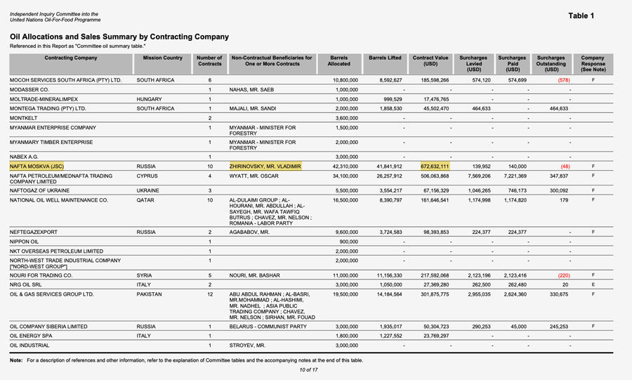 Схема работала следующим образом. Жириновский за оговоренный процент, который потом депонировался на банковский счет его сына Игоря Лебедева, добивался от своего «друга» Саддама квот на вывоз нефти — например, «Нафта» получила не меньше 10 контрактов на сумму $ 672 миллионов, а записанная на Исакова «Русская инженерная компания» — 5 контрактов на $ 517 млн.