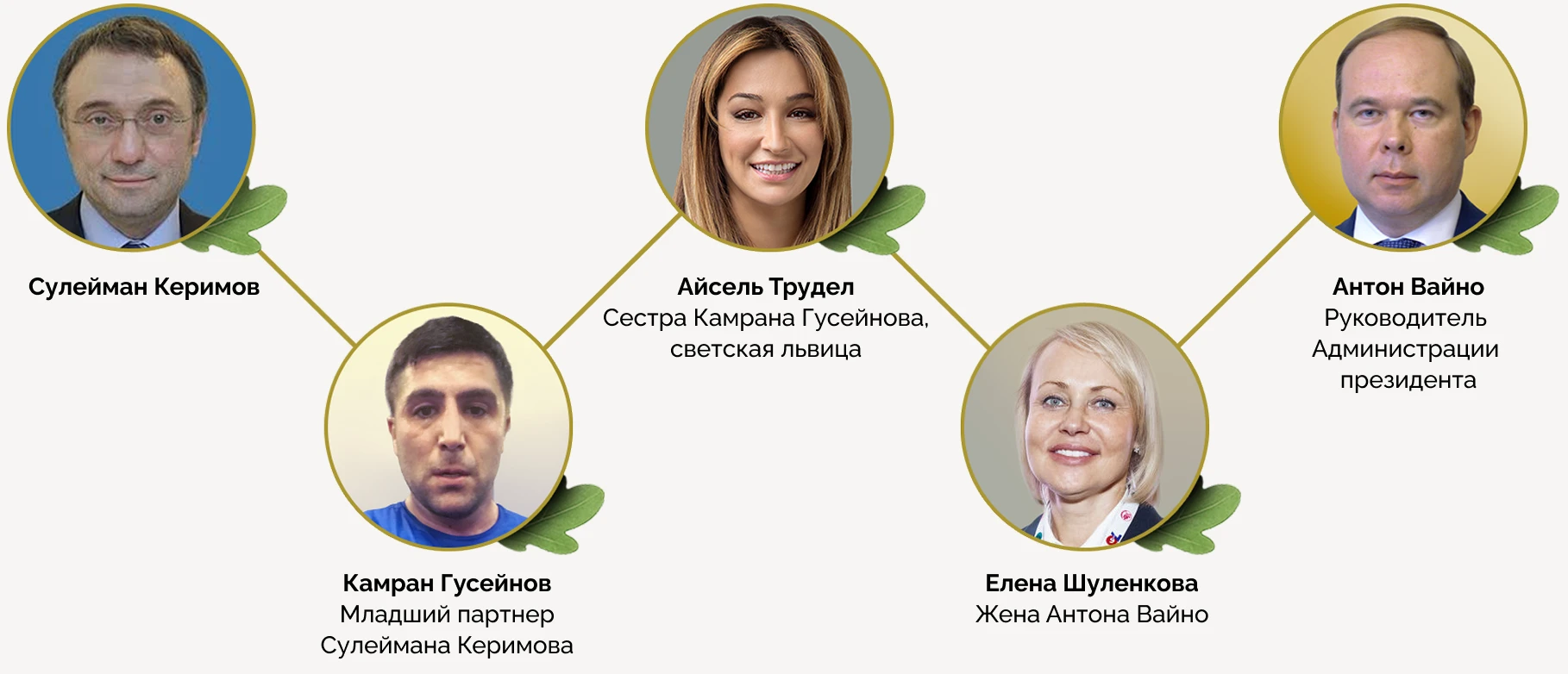 Сулейман Керимов и его семья, Рамзан Кадыров и его семья, Антон Вайно и его семья, семьи Дмитрия Пескова и Алексея Громова, а также Тина Канделаки и Андрей Малахов