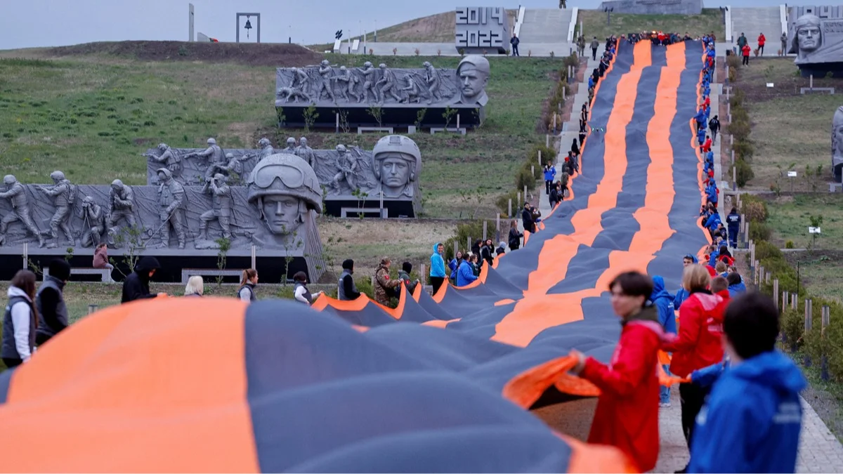 Церемония, посвящённая годовщине окончания Второй мировой войны, у реконструированного российскими оккупационными властями мемориала Саур-Могила, Донецкая область, Украина, 8 мая 2024 года. Фото: Александр Ермоченко / Reuters / Scanpix / LETA