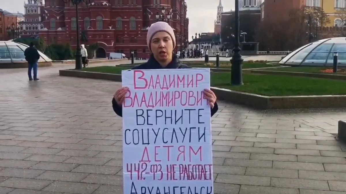 Черепанова обратилась к Владимиру Путину. Ее пикет был посвящен проблеме оказания социальных услуг детям с ограниченными возможностями здоровья. Жительницу Архангельской области доставили в отделение полиции Китай-город, а затем отпустили без протокола, сообщили «Новой-Европа» ее близкие.