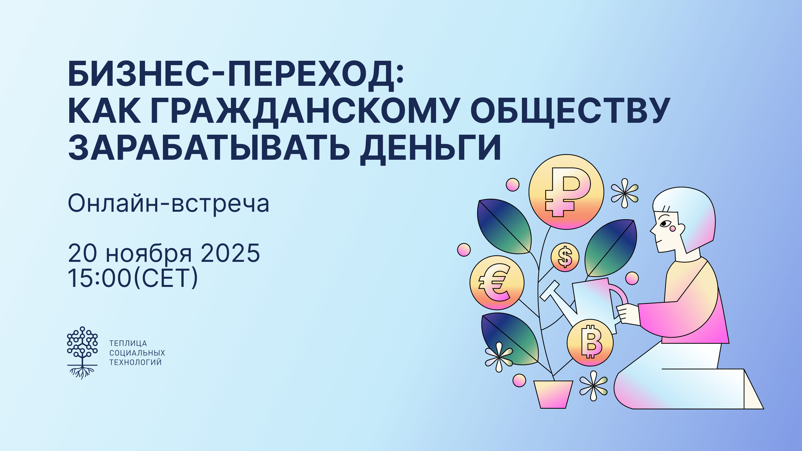 На встрече мы соберём тех, кто либо уже совершил «бизнес-переход», либо планирует его для обмена опытом. При этом, организаторы надеются, что «бизнес-переход», как процесс трансформации, не станет местом назначения – подземным переходом, символом безнадёжности и нужды. Вместе мы обсудим успешные кейсы, провалы, стратегии выхода на рынок и новые возможности для социального предпринимательства. Наша цель: сформировать пространство обмена опытом и взаимной поддержки и сократить число ошибок и фрустрирующих моментов на пути к финансовой стабильности.