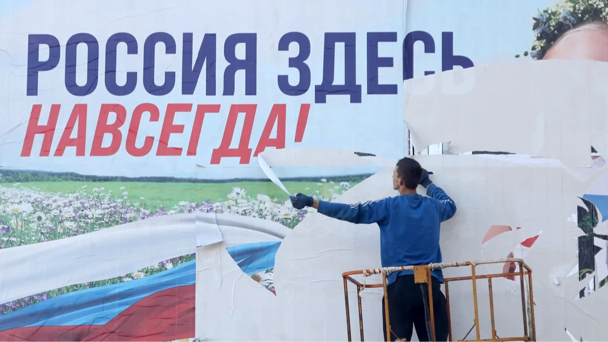Рабочий срывает билборд с надписью «Россия здесь навсегда» в освобождённом от российской оккупации Херсоне, Украина, 14 ноября 2022 года. Фото: AFP / Scanpix / LETA