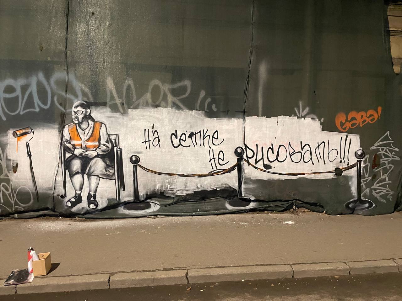 — Посыл у каждой работы свой. В последнее время больше работ делаю на временных строительных заграждениях. Мне очень понравилось работать на фасадной сетке. С одной стороны, это привлекает внимание, что здание стоит обтянутое сеткой, и не факт, что о нем в ближайшее время вспомнят. Один посыл такой. А второй посыл — графический, текстовой информационный. И когда эти посылы сочетаются — это допустимое поле в рамках современного административного и уголовного законодательства. Памятники я, естественно, не трогаю, свеже отреставрированные дома и поверхности тоже. А если стена уже запачкана, кто-то накалякал начирикал какие-то глупости написал, то почему бы сверху не сделать что-то красивое?