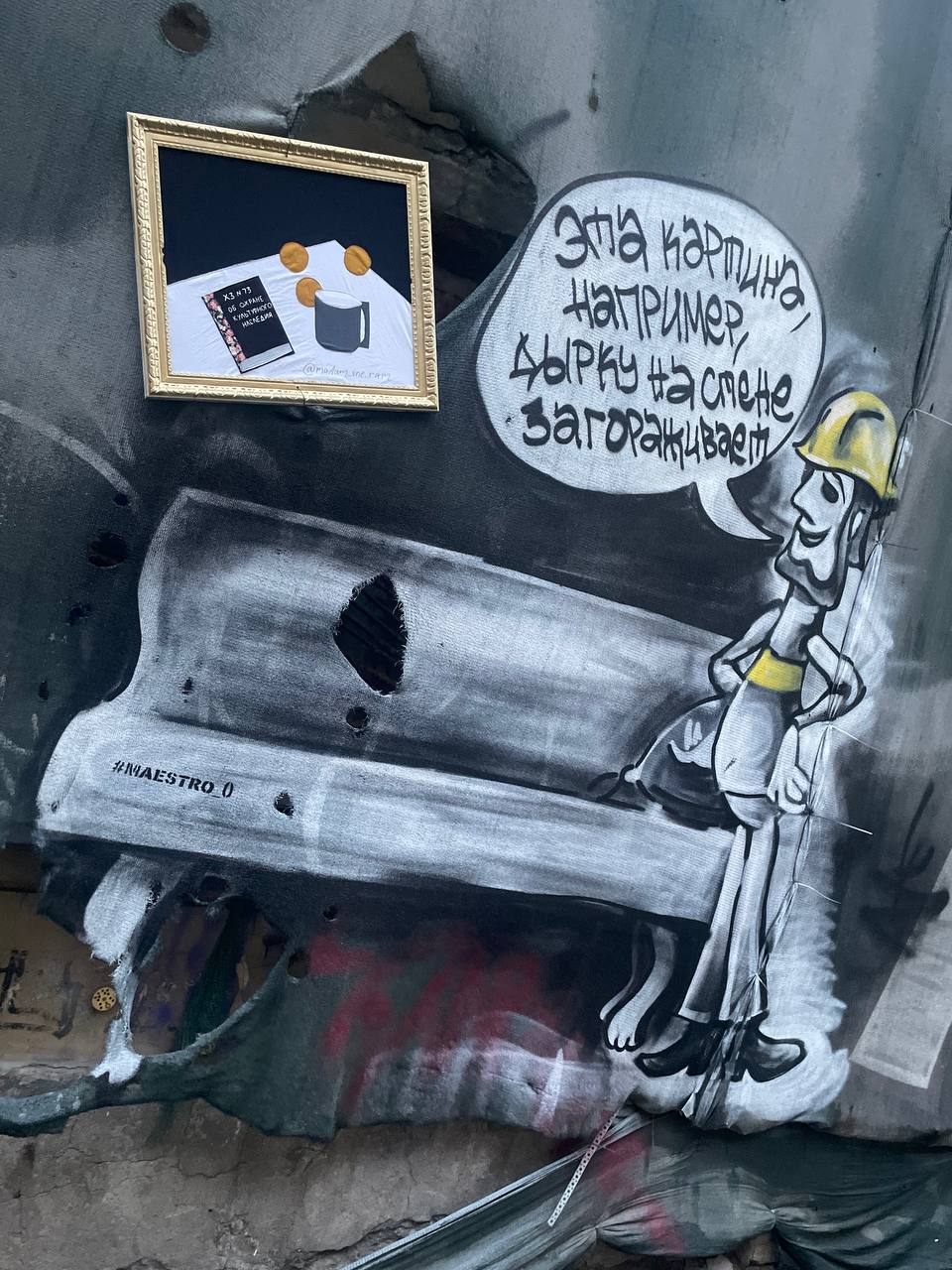 — С 2020 года. Я ровно в ковид начал этим заниматься. После того как познакомился с творчеством Павла Пухова (Паша 183 — известный уличный художник 2000-х, работавший в Москве и Петербурге в основном на остро социальные темы — прим. «Бумаги»). Я изучил всю информацию про его творчество, которая есть в открытом доступе. Очень вдохновился и понял, что мне это очень близко и почему я не могу делать что-то похожее. Что не в галерее будет выставляться, а делать от души и работать с пространством, с окружением. Андеграунд — это высшая форма проявления искусства. Я не сторонник коммерческих вещей в силу своих внутренних убеждений. Есть современное искусство хорошее, действительно достойное внимания, а есть очень много того, что представляет собой мыльный пузырь.