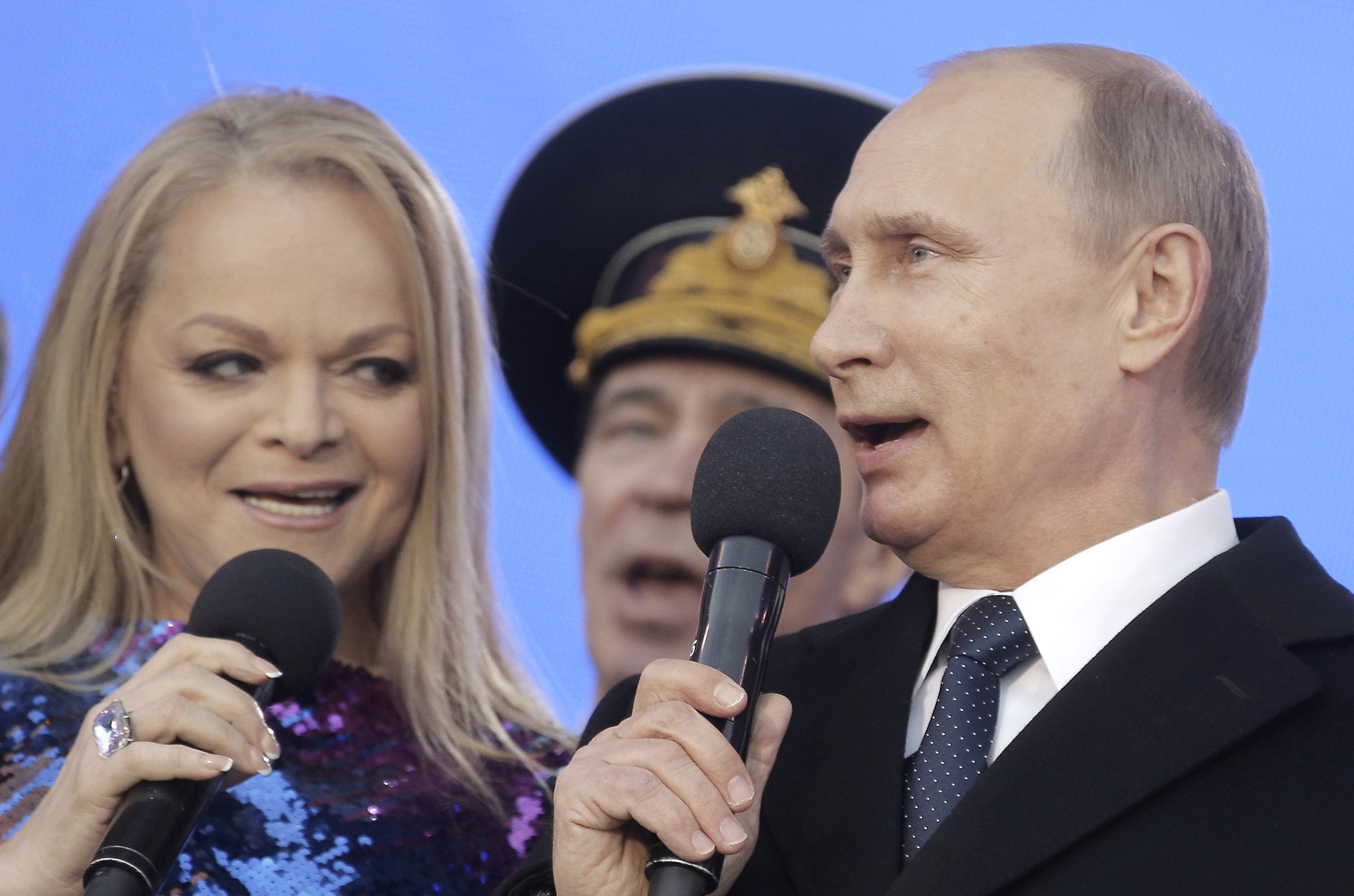 Фото: Владимир и Лариса Долина исполняют национальный гимн во время праздничного концерта в Москве, посвящённого первой годовщине аннексии Крыма, 18 марта 2015 года. REUTERS/Maxim Shipenkov