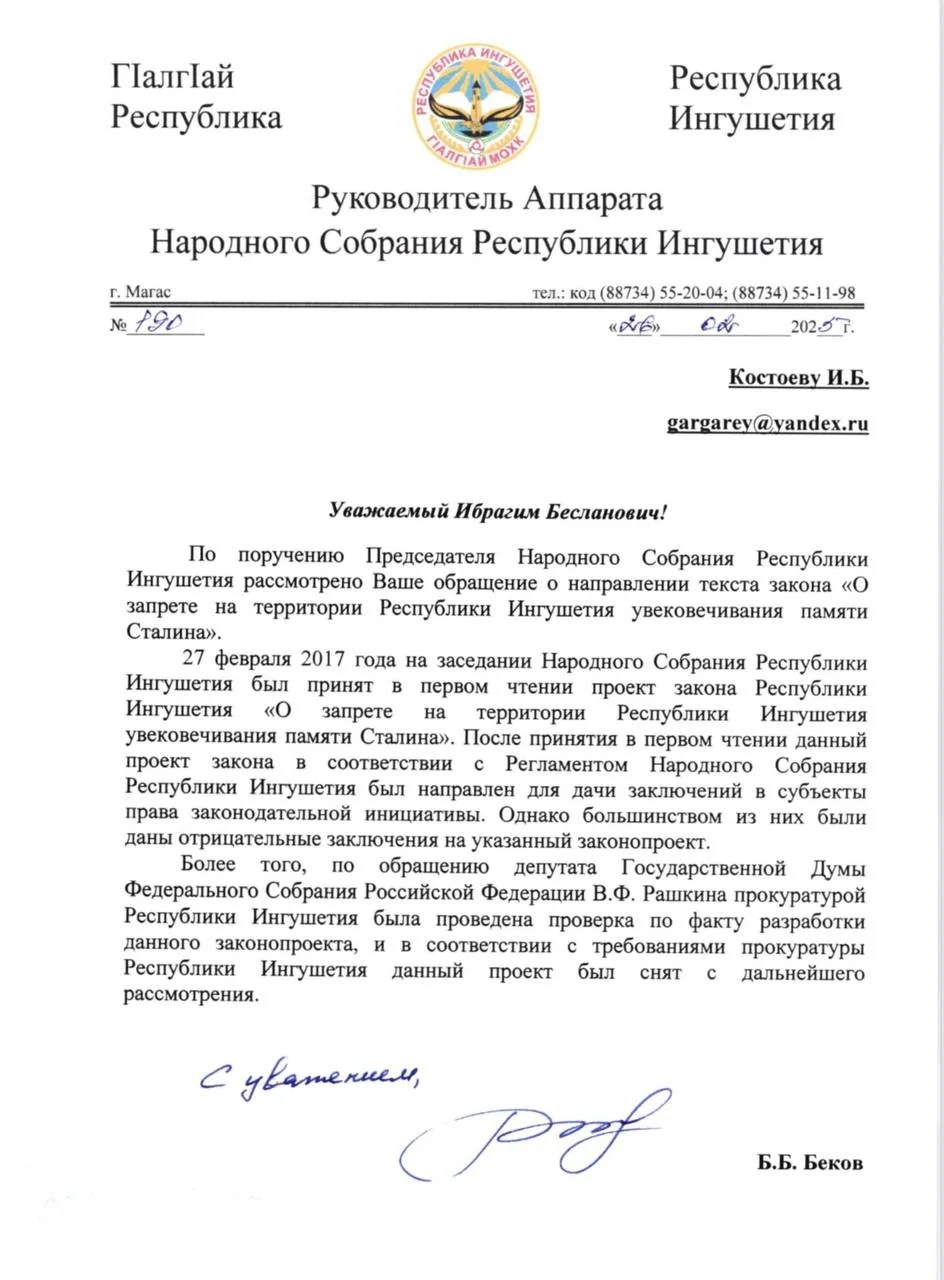 В феврале 2017 года одной из главных федеральных новостей стало принятие Народным Собранием (парламентом) Республики Ингушетия в первом чтении проекта закона «О запрете на территории Республики Ингушетия увековечения памяти Сталина».