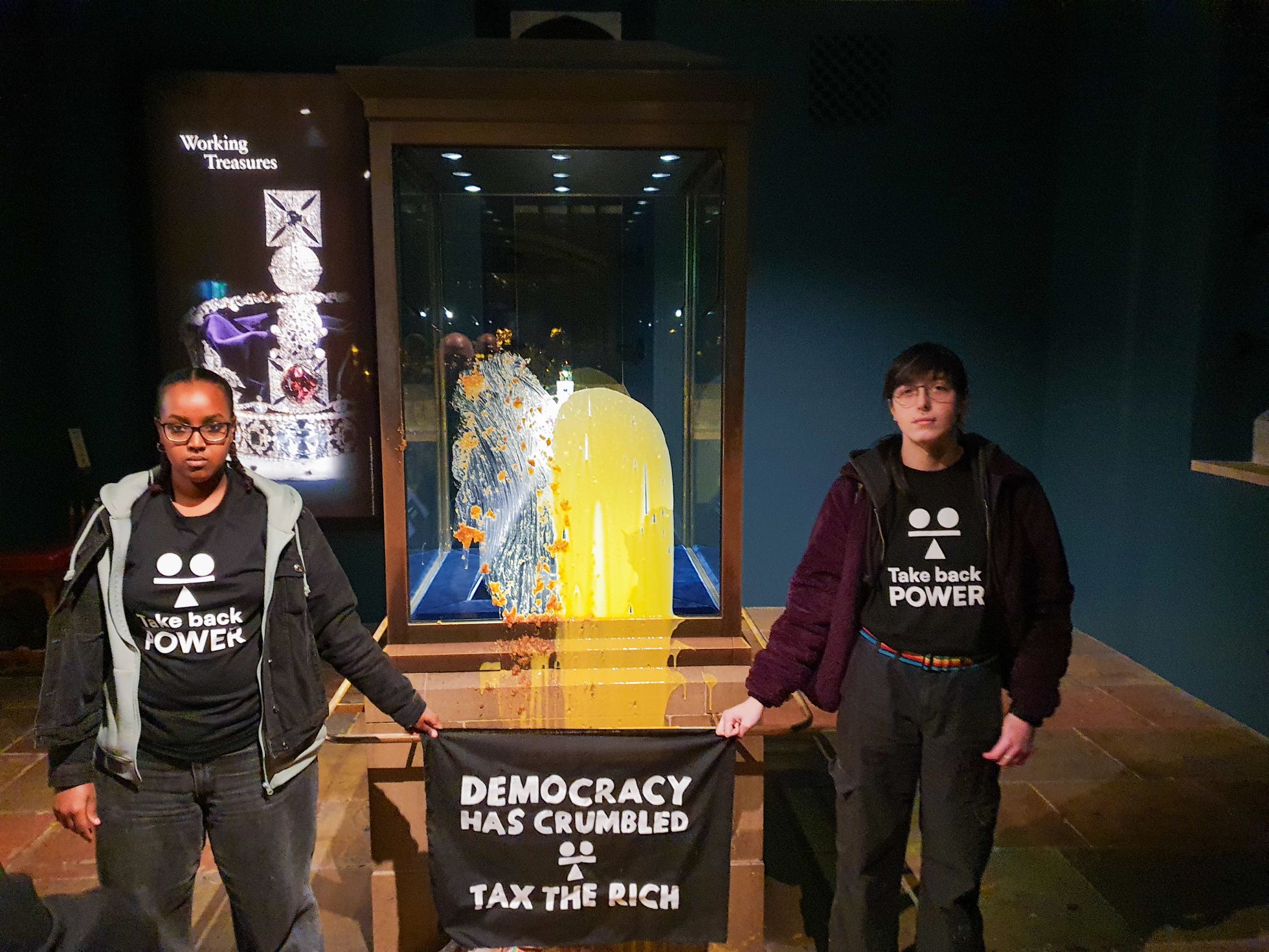 Помимо пирога, а точнее крамбла (от англ. crumble — один из рецептов приготовления такой выпечки можно прочитать на «Би-би-си»), активисты принесли с собой в музей емкость с заварным кремом, который также вылили на витрину с короной. Один из участников акции при этом крикнул: «Демократия рухнула» (Democracy has crumbled), а другой добавил: «Британия разбита. Мы пришли сюда, к сокровищам нации, чтобы вернуть власть».
