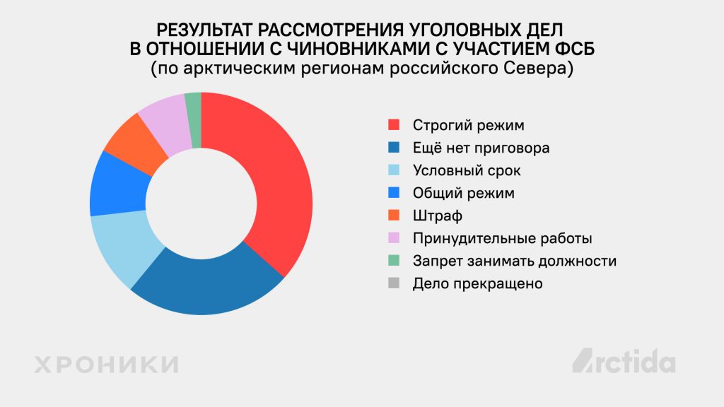 В то же время в арктических регионах пока не произошло резкого скачка по количеству дел, заводимых на высокопоставленных чиновников. Но изменение наблюдается в другом — всё больше их заместителей и их подельников попадает в поле зрения силовиков, а среди коррупционных дел, которые в арктических регионах чаще всего расследуют на местах и при участии ФСБ, всё больше доля тех, что заканчиваются лишением свободы, причем на всё большие сроки. Кроме того, в последние годы получила распространение практика заведения новых уголовных дел на чиновников, уже отбывающих наказание по другому эпизоду.